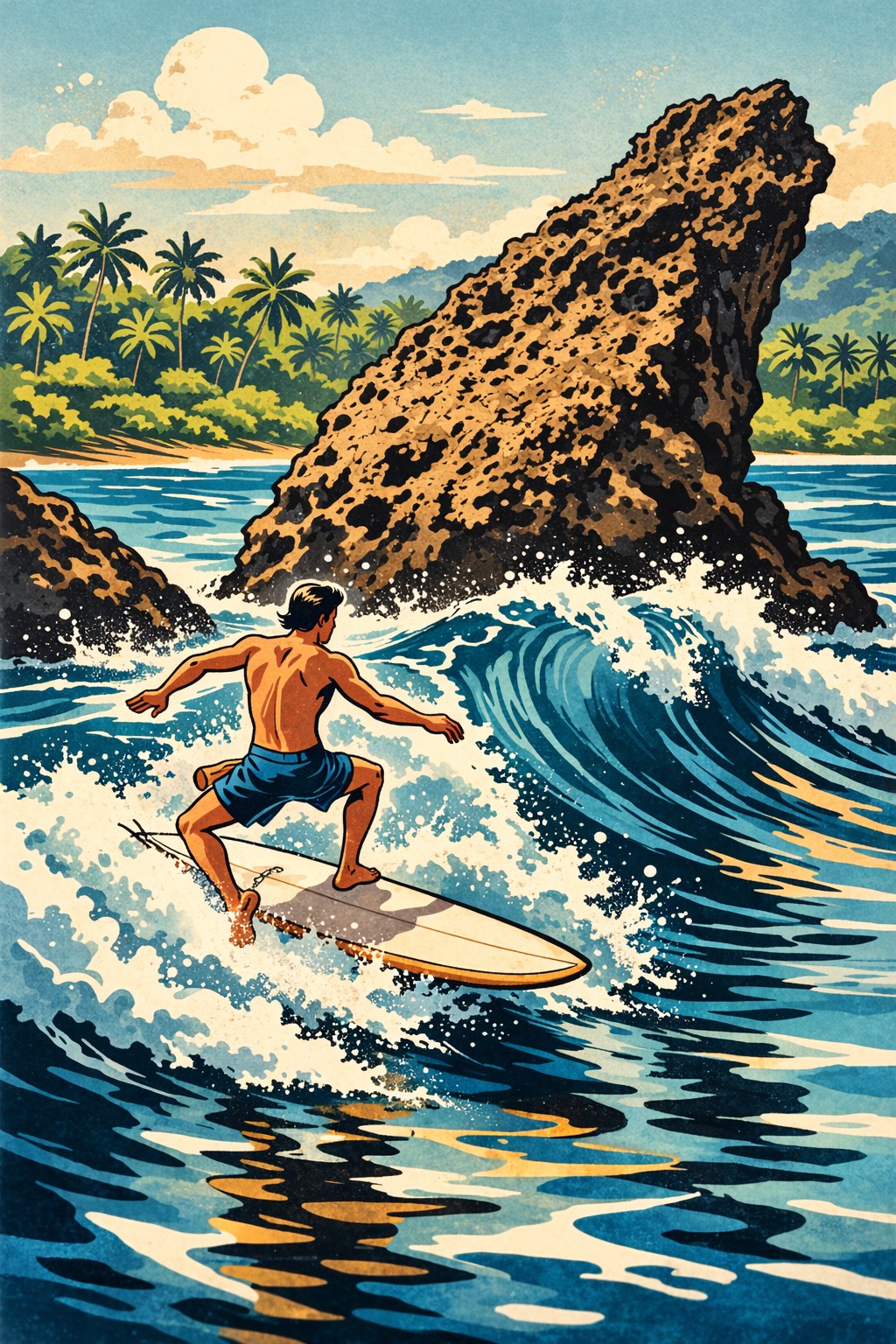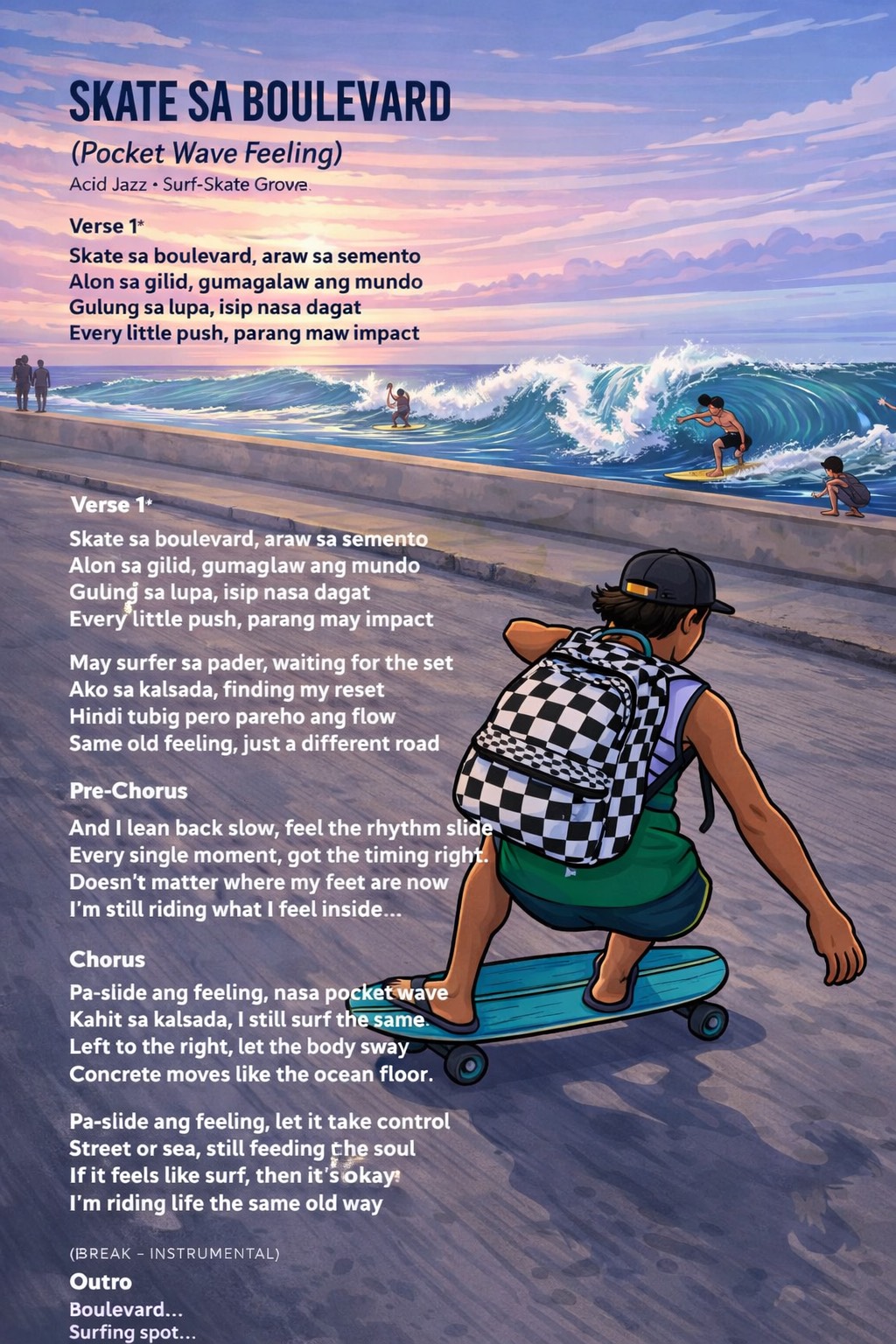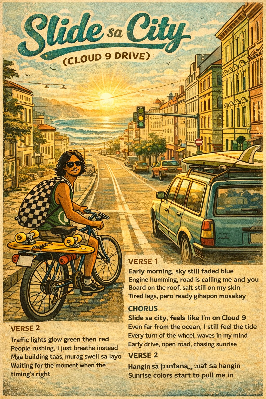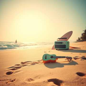 Surf chill, lo-fi, tropical vibe, 85–95 BPM, warm guitar, soft beat, male vocal, relaxed, dreamy, loopable hook, island sunset mood