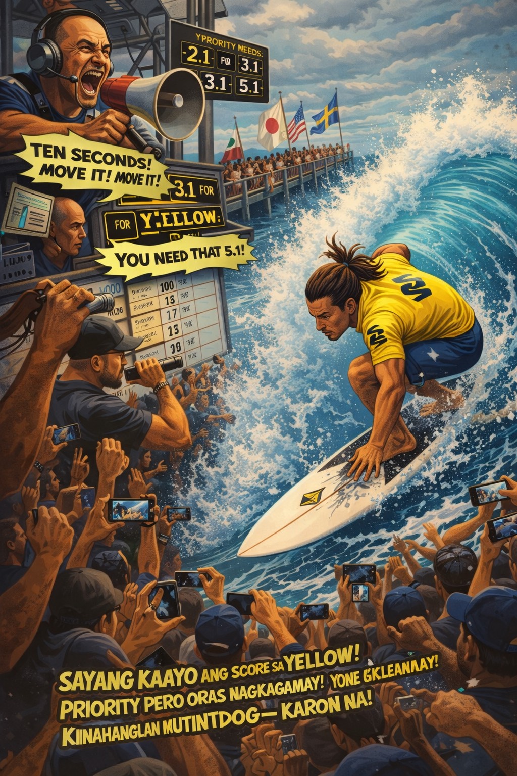Upbeat heavy rock rap, aggressive drums, distorted guitar riffs, surf competition energy, WSL-style commentary, hype crowd chants, male rap vocal, minimal singing, cinematic but fast, adrenaline-driven, blues solo, upbeat