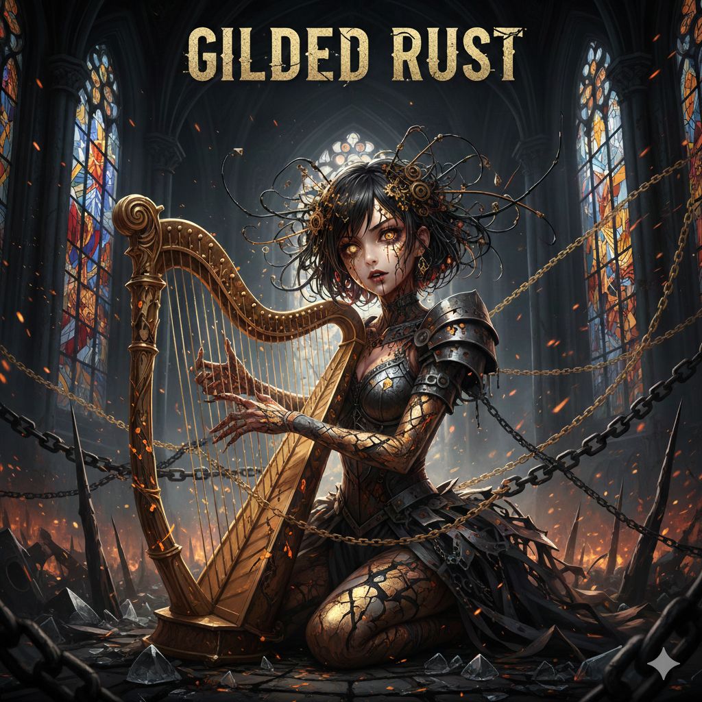 Industrial Horrorcore, Dark Trap, Haunting Harp, Distorted Ethereal Vocals, Aggressive Female Rap, Gritty Industrial Percussion, Cinematic Dark atmosphere
