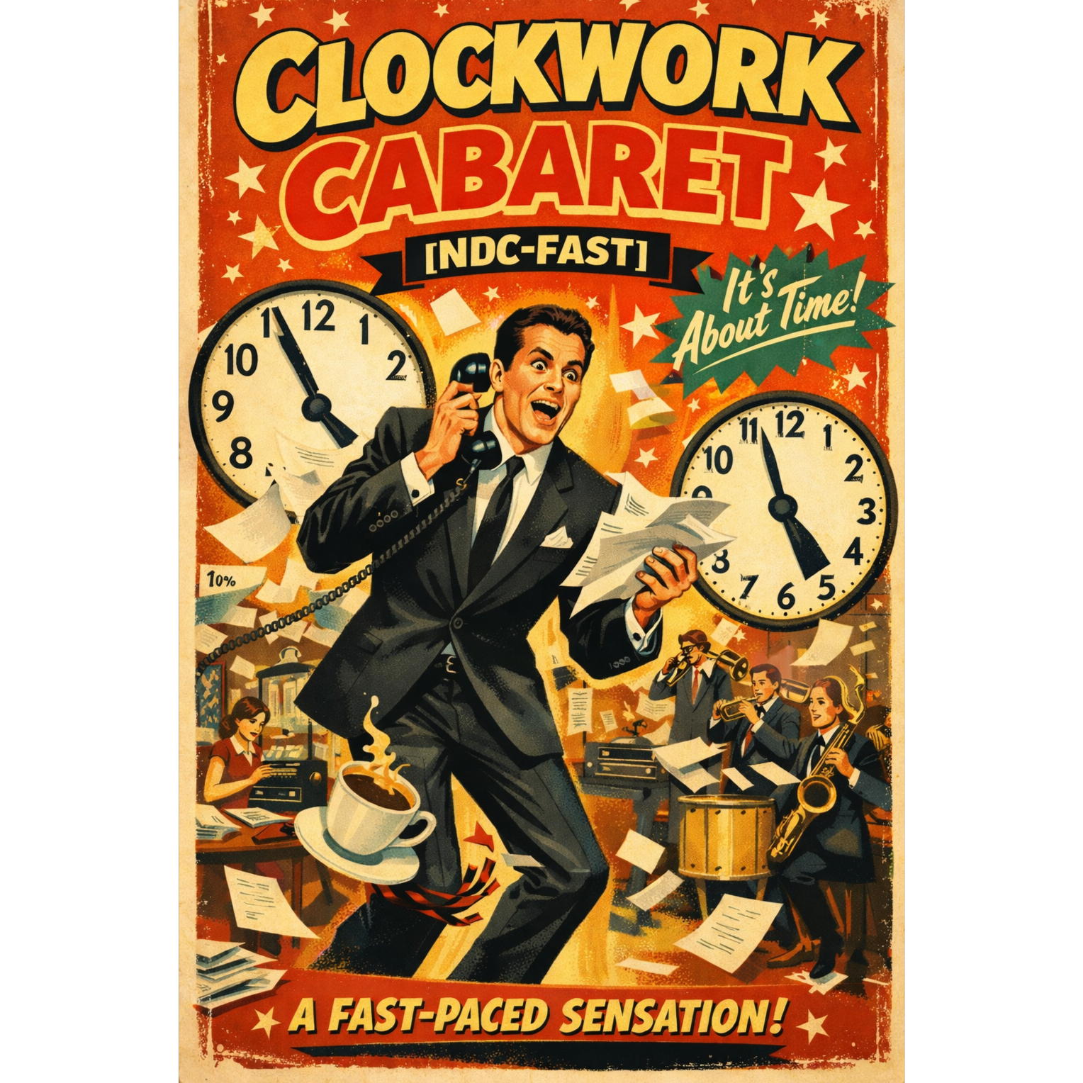 High-energy 1960s British revue-style big band at 204 BPM, sharp brass stabs, walking upright bass, fast brushed snare turning into tight swing kit, playful clarinet runs, bright piano comping, theatrical stage vibe, light tap-dance percussion textures, male lead vocal with crisp diction and fast articulation, witty and rhythmic delivery, no sloppy phrasing, natural breath control, clean vintage mix, wide stereo brass, tight rhythm section, controlled chaos, energetic but precise, no modern EDM elements