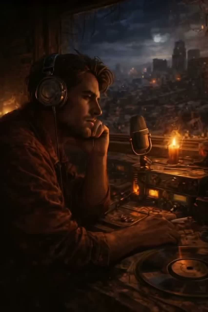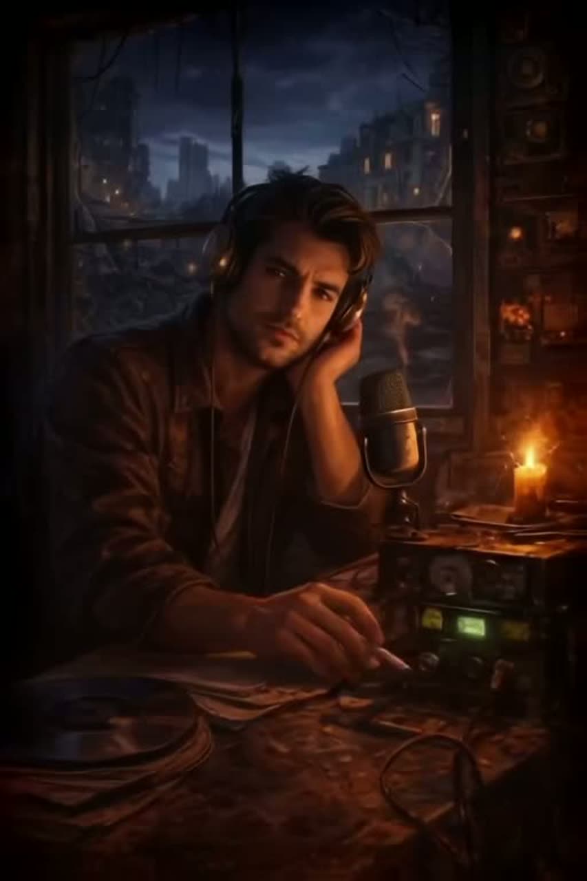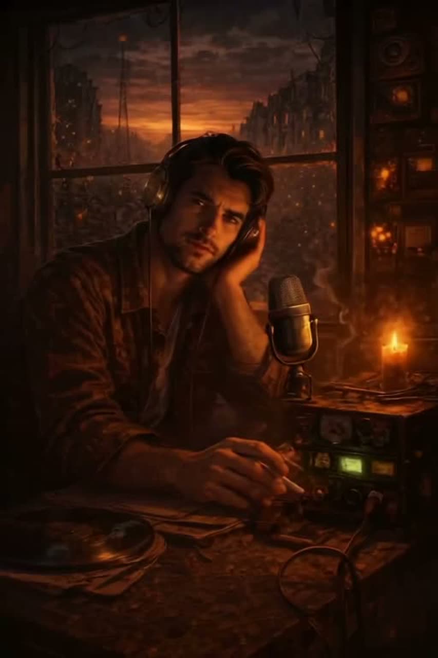 “1950s-inspired doo-wop love song in a post-apocalyptic late-night radio broadcast style, Slow-mid tempo (≈70–74 BPM) with a strong, emotionally memorable chorus, Warm, intimate male lead vocal with gentle gravel and close-mic AM radio coloration, Prominent stacked doo-wop harmonies (ooo-wah, sha-la-la) mixed warmly for instant nostalgia, Upright bass with soft walking groove, brushed drums, muted tremolo electric guitar, subtle piano chords, Light vinyl crackle and radio static that fades in and out naturally, Lyrics framed as a lonely DJ broadcast reaching out to unknown listeners—comforting, romantic, and hopeful rather than bleak, Cinematic but simple, haunting yet reassuring, like discovering a forgotten signal you want to stay with, ”