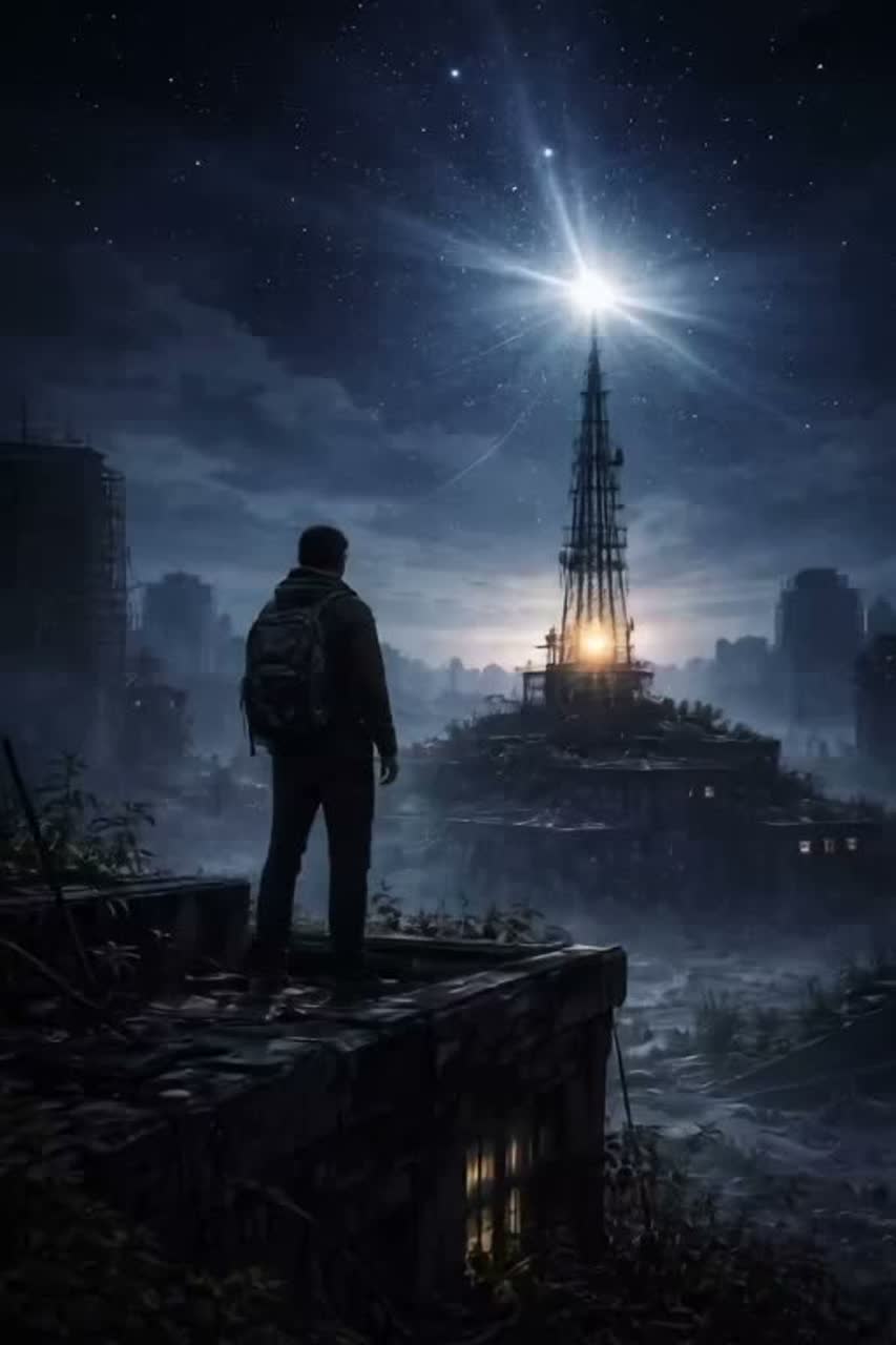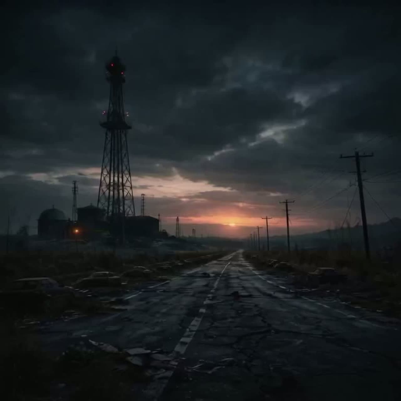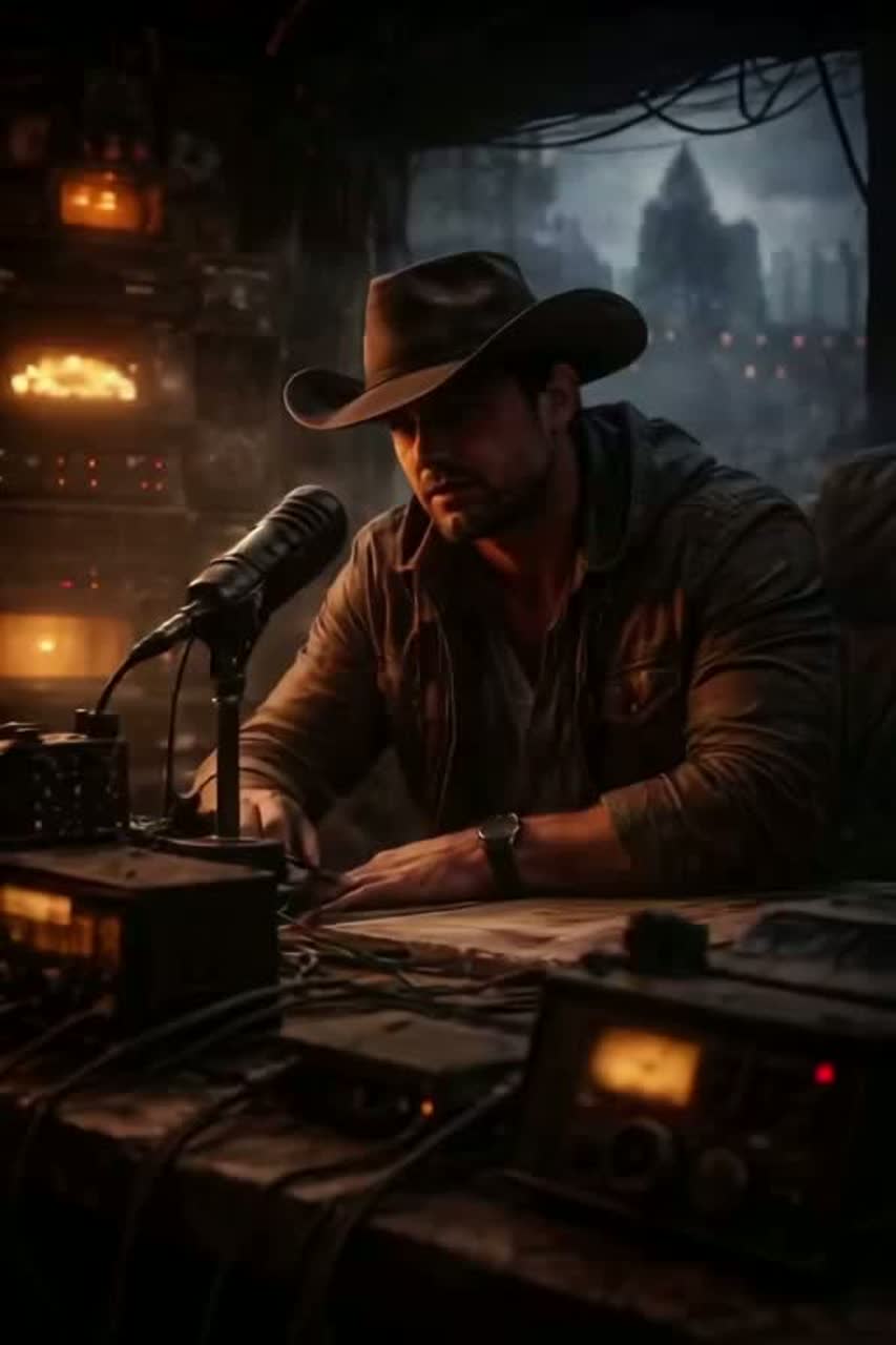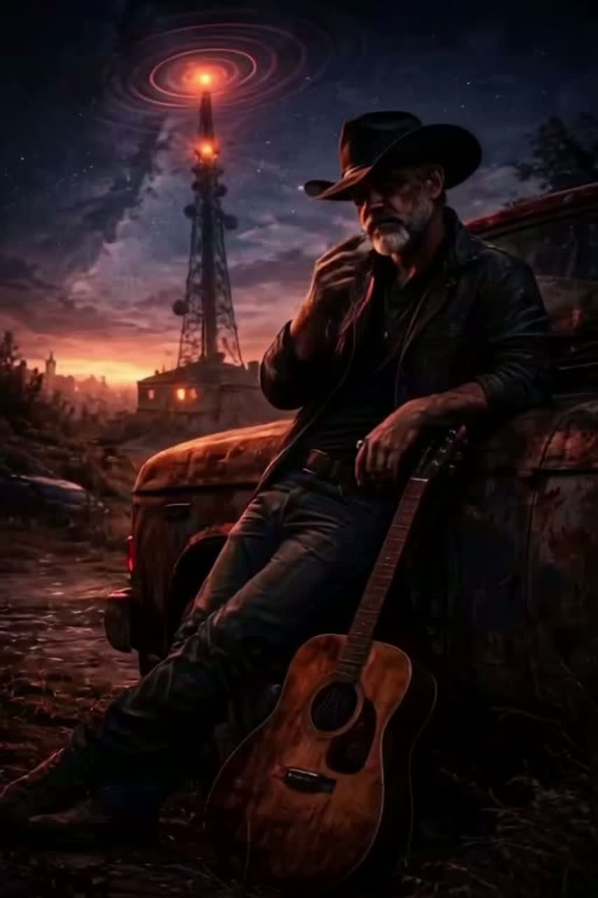 Post-apocalyptic radio transmission song with survival grit and emotional weight, Dark Americana blended with cinematic sci-fi atmosphere, Slow-building tempo, minor key, Instruments: low acoustic guitar, distant electric guitar swells, subtle synth drone, heartbeat kick drum, brushed snare, atmospheric pads, light distortion, Male vocal, weary but defiant, intimate verses growing into powerful chorus, Static effects, radio crackle, spoken-word intro and bridge, Mood: end-of-the-world resilience, resistance broadcast, human voices refusing silence, Late-night, haunting, replay-worthy