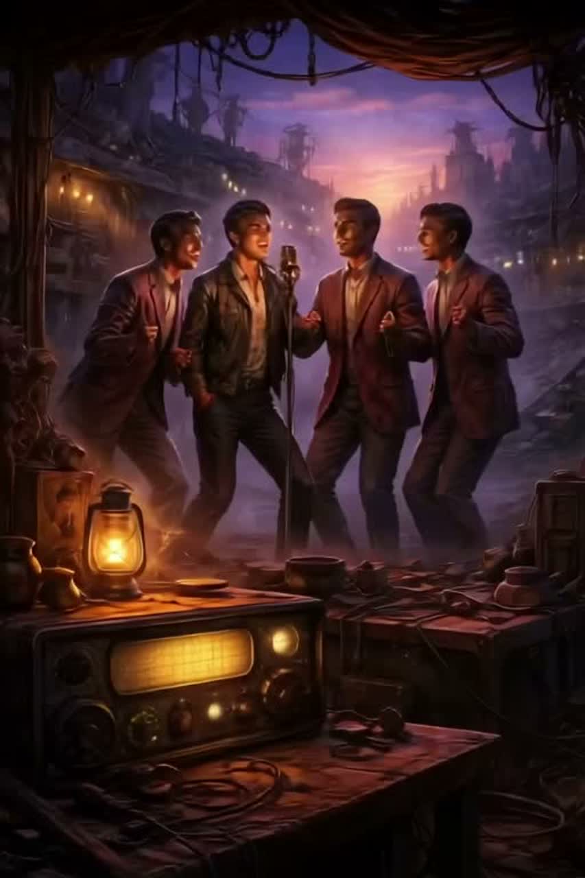 1950s doo-wop vocal harmonies mixed with post-apocalyptic atmosphere, Vintage male lead with group harmonies singing ooo-wah and sha-doo-bee backing vocals, Snapping rhythm, upright bass, light saxophone riffs, and analog radio ambience, Romantic but haunting tone like a lost broadcast from Station 509 in a ruined world