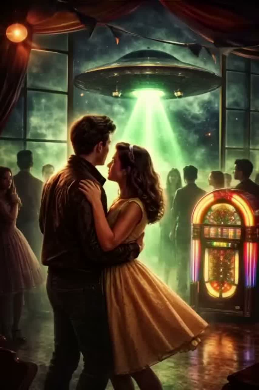 1950s doo-wop sci-fi horror song with male vocal group harmonies, shoo-bop backing vocals, vintage rock and roll drums, upright bass, electric guitar, and eerie theremin, Retro alien invasion theme with nostalgic sock-hop atmosphere turning creepy, Catchy doo-wop chorus mixed with vintage science fiction horror mood