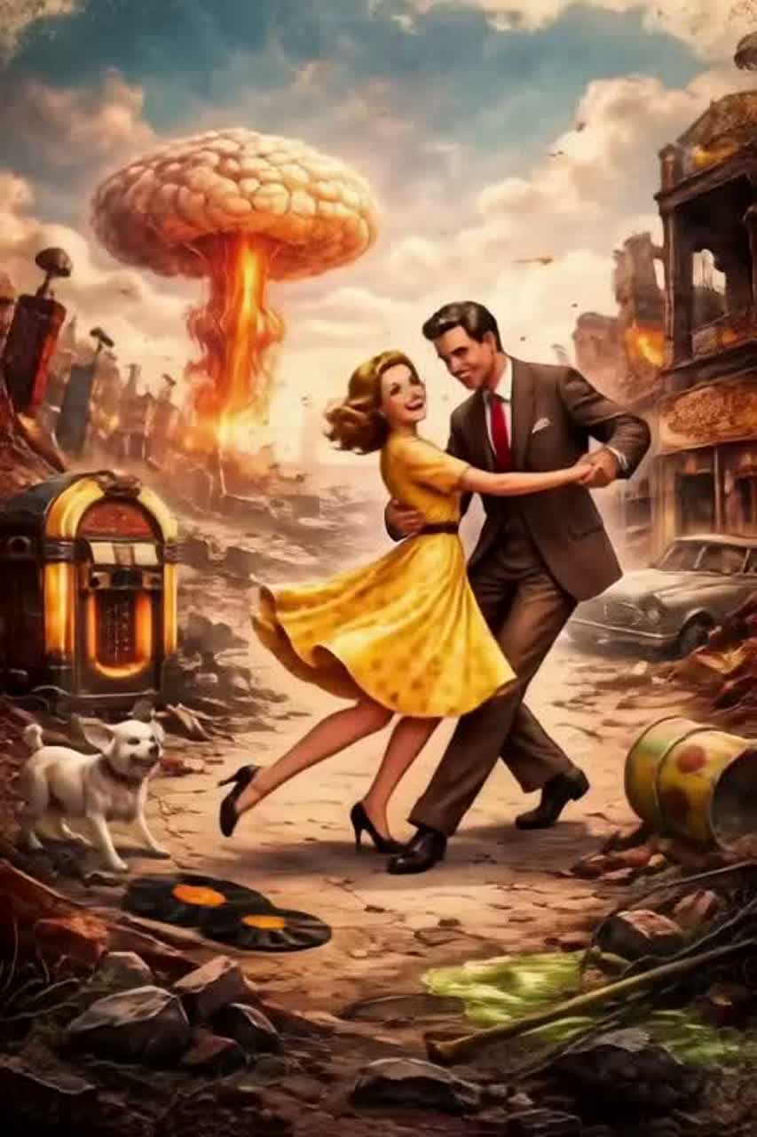 1950s doo-wop love song with dark post-apocalyptic humor, Upbeat tempo, major key with ironic tone, Instruments: upright bass, brushed drums, clean electric guitar, piano, hand claps, soft sax accents, Male lead vocal with warm vintage crooner style, Tight doo-wop backing harmonies (ooo-wah, sha-na-na), Radio broadcast intro and outro with light static, Mood: cheerful romance against nuclear devastation, playful, unsettling, nostalgic, replayable, Post-war optimism contrasted with end-of-the-world lyrics