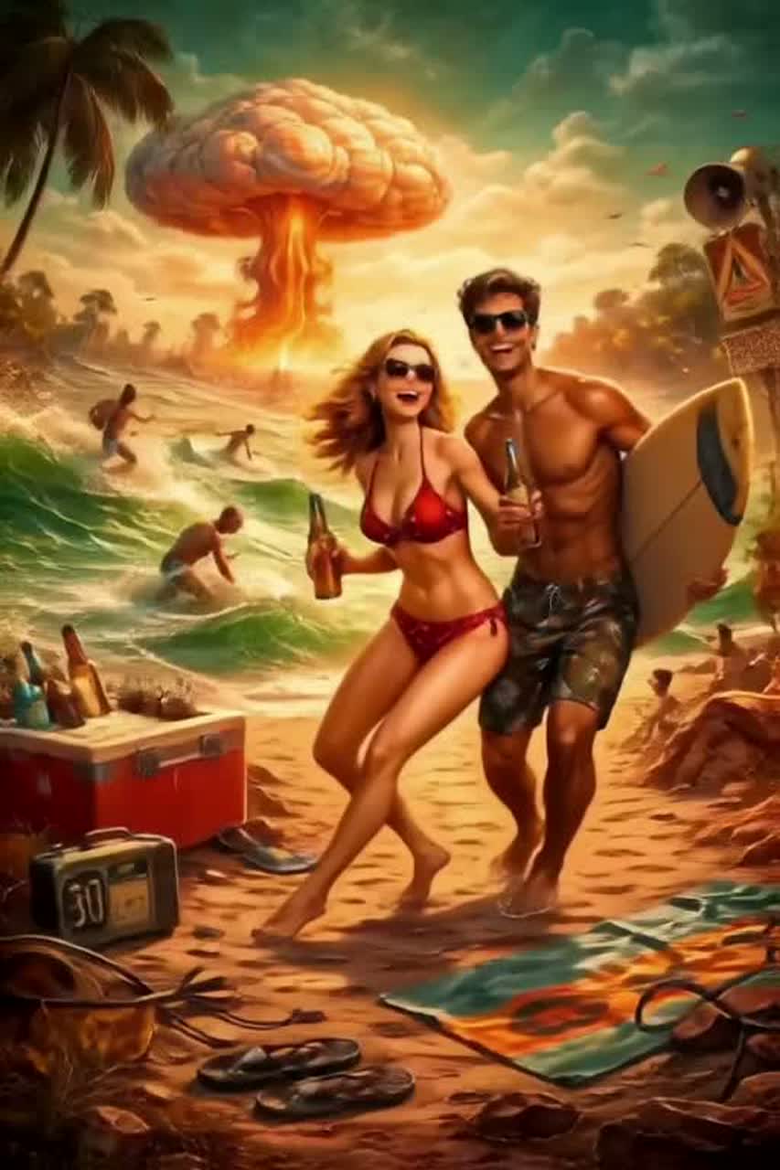 High-energy surf rock with post-apocalyptic irony, Fast tempo (≈165–175 BPM), Tremolo-drenched electric guitar leads, driving surf bass, punchy live drums with relentless momentum, Bright major-key melodies contrasted with dark, ironic fallout imagery, Energetic male or female vocal with carefree, shout-sung delivery, Minimal polish, raw and kinetic, Sudden breaks and hard cuts, Feels like a sunny beach party racing the end of the world—joyful, chaotic, cinematic, and built to end too soon for instant replays, Include a mid-song radio interruption with cheerful spoken DJ voice, brief static drop, then beat slams back in harder