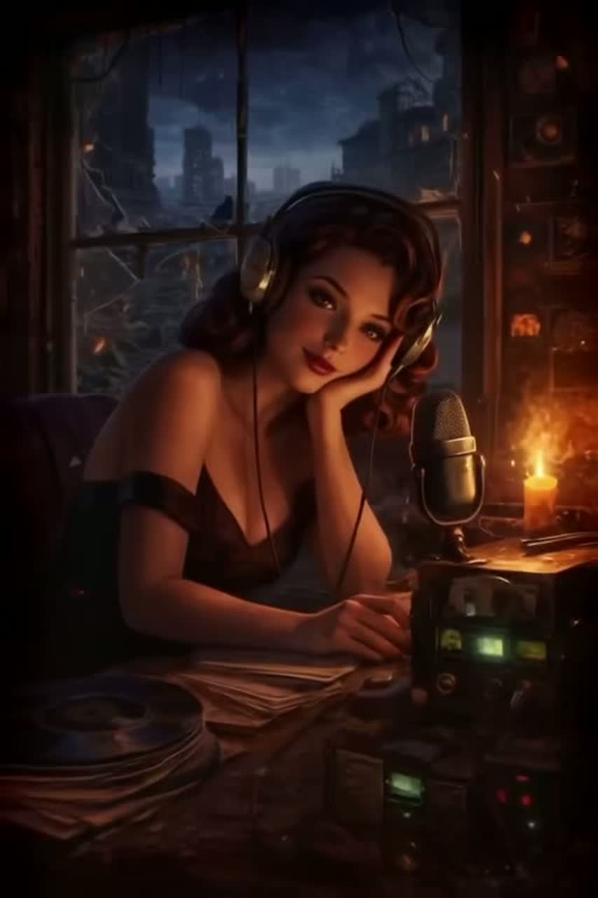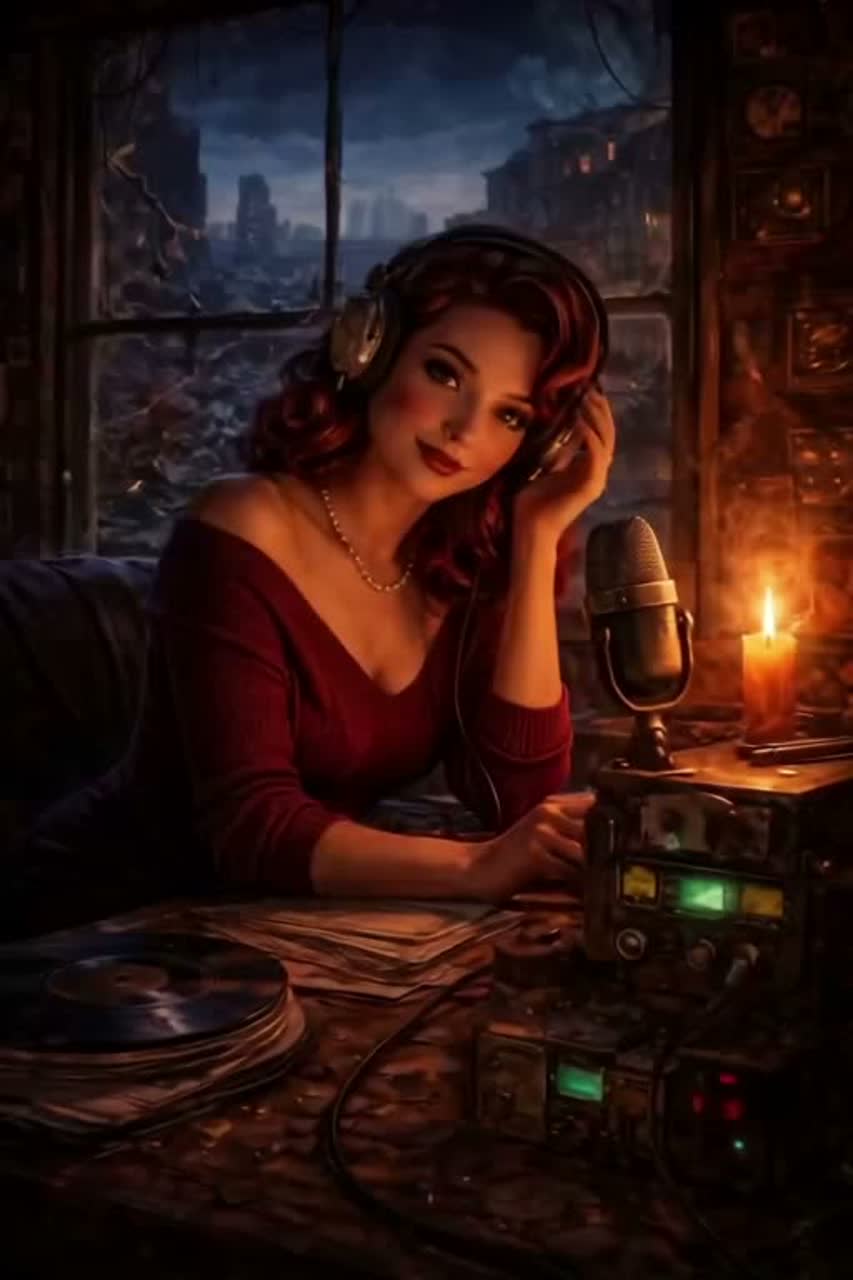 1950s doo-wop love song with a post-apocalyptic late-night radio vibe, Flirtatious, warm female lead vocal—soft, intimate, playful, with subtle smiles in the delivery, Close doo-wop harmonies (ooo-wah, sha-la-la) mixed warmly, teasing and affectionate, Slow-mid tempo (≈70–74 BPM) with a gentle sway, Upright bass, brushed drums, tremolo electric guitar, mellow piano, Vintage AM radio tone with light static, vinyl crackle, and tape warmth, Spoken DJ lines whispered or spoken close to the mic, Romantic, cozy, slightly mischievous mood—feels like a late-night broadcast meant just for one listener in the ruins, Replayable, comforting, quietly seductive