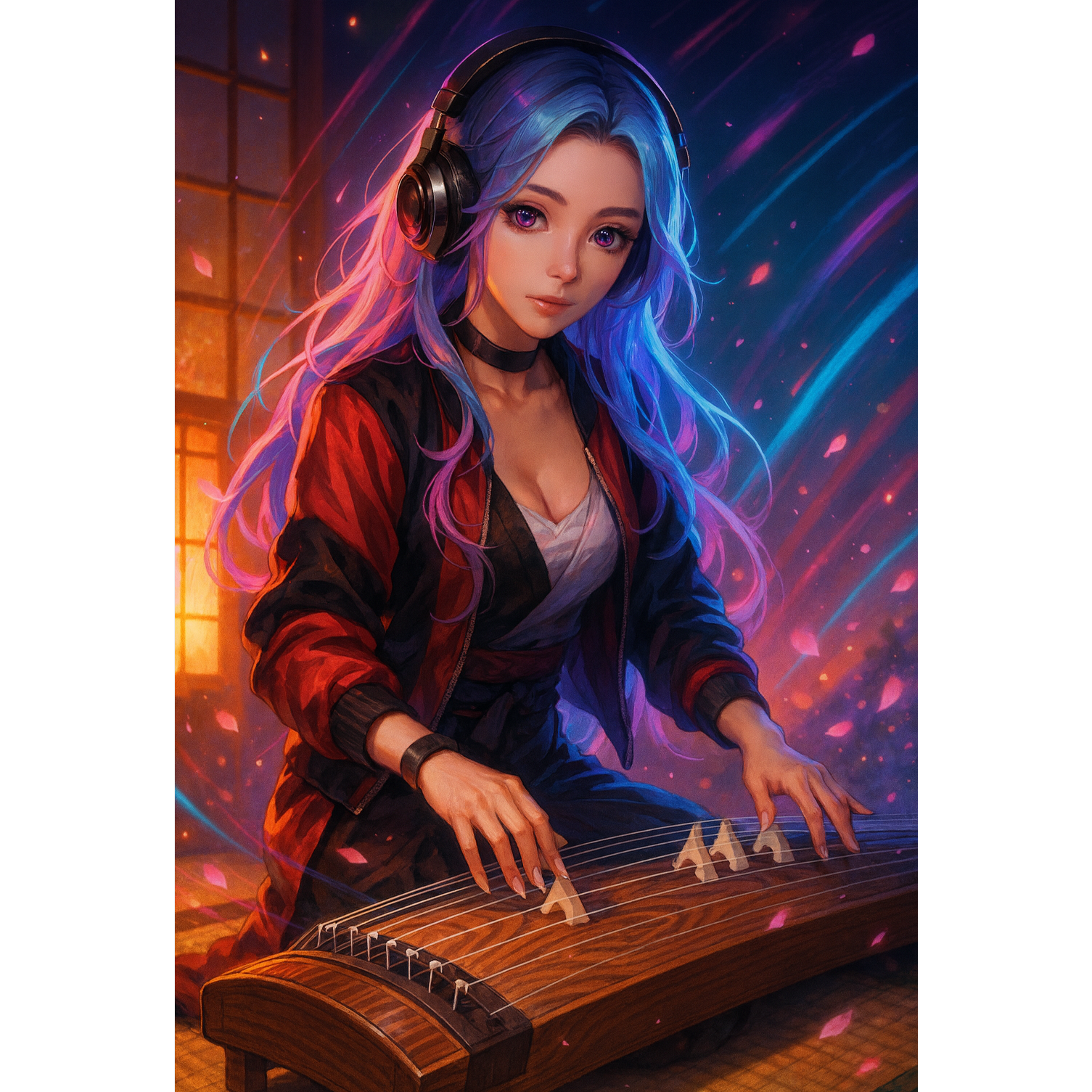 vaportrap, electronic, synthesized plucked string sound, koto, rapid arpeggio, hypnotic, tempo is moderately fast, contemplative, melancholic, production is clean, clear separation between the melodic and atmospheric elements