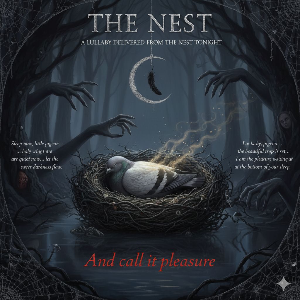Gothic Lullaby, Slow, cinematic 3/4 time signature, Eerie, beautiful female vocal with a breathy, seductive tone, Heavy, deep synth bass and minimal percussion, Instrumentation features sustained, chilling string pads, a sparse music box melody, and echoing whispers that underscore the key phrases, The song must sound predatory, hypnotic, and ritually calm, like a siren leading a vessel to ruin, Breakdown of Style Intent: