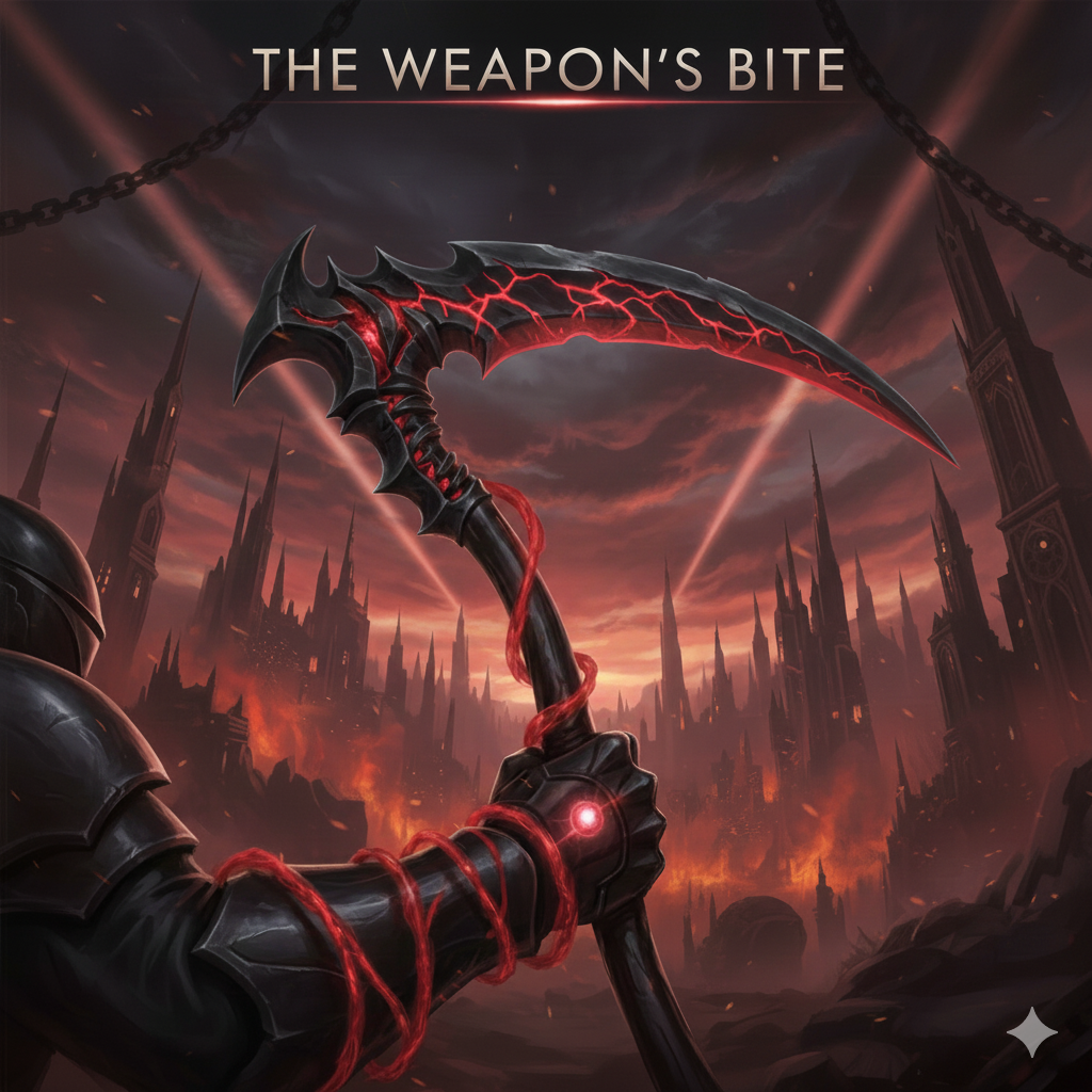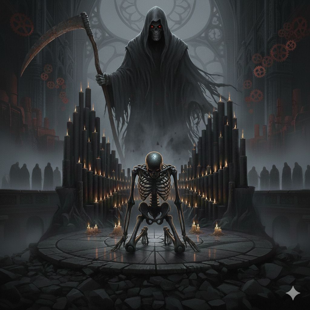 Dark Orchestral Metal / Industrial Rock, Vibe: Triumphal, Unapologetically Dark, Epic, Driving, martial rhythm with heavy war drums and distorted strings, Vocals must be deep, resonant, and commandingly powerful, suitable for a Seraphim Demon, The sound should convey calculated cruelty, necessary Darkness, and the ultimate utility of power, Contrast the heavy, industrial beat with moments of dramatic, soaring orchestration, Use metallic clangs and a final sound effect of a massive scythe sweeping