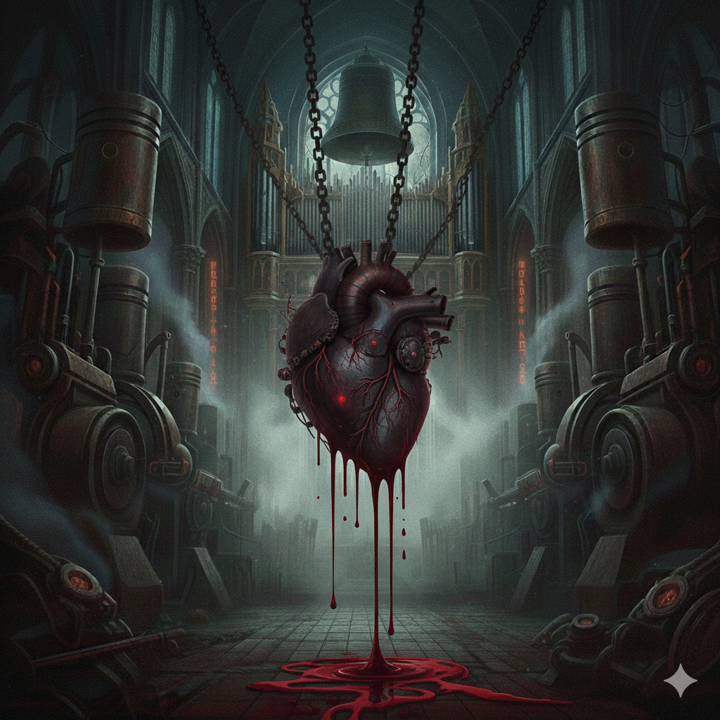 This composition is The Imperial Dirge, the sound of necessary Darkness, It opens with the sharp, metallic strike of black pepper and the cold, austere discipline of cypress, The heart is the smoky, complex command of oud and vetiver, layered with a hint of sacred, fallen celestial incense, The base smoulders with animalic, primal authority - raw leather and castoreum - all bound by the resolute anchor of cedarwood, Structure: Start with Organ and maintain rhythm throughout as a steady heart beat, maintain the ticking of a Celestial Clock as a metronome, then resolve into a slow, dominant drum pulse of a heart-beat and electric double-bass, Theme: The sound of a final, disciplined conquest