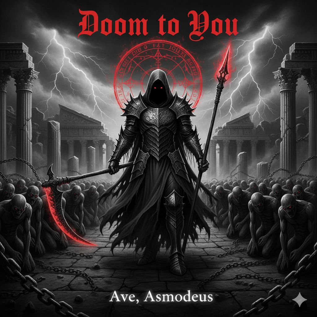 Epic Dark Orchestral, Martial Industrial, Gothic Chant, Roman War Drums, Cold Brass, Ominous cold wind sound effect, Quiet rhythmic metallic clanking, like slow hammering, Deep male throat singing rises, ancient and ominous, Massive echoing Roman war drums establish a slow, inexorable march, Dominant, mournful low brass melody, cold and disciplined, All-male choir sings a low-register chant, a dead language of doom, Orchestration swells with heavy chain sounds and the scraping of a massive scythe, Abrupt cut to silence, Low, resonant, double-tracked male whisper and growl speaks: "Doom to you, " Final, single thunderous drum hit fades to silence