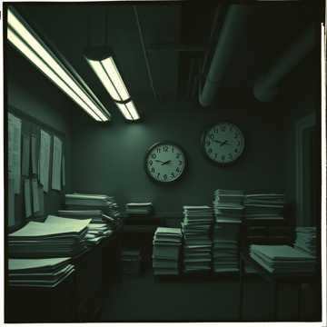 Industrial Gothic Organ with Darkwave Synth, Instruments: Heavy, sustained Gothic Organ, sharp Chains/Whips percussion, distorted Wailing/Screaming synth layers, steady Photocopier-like beat (drum machine), bass line mimicking the Humdrum of a Commute, Vocal Style: Monotone, almost bored narrator