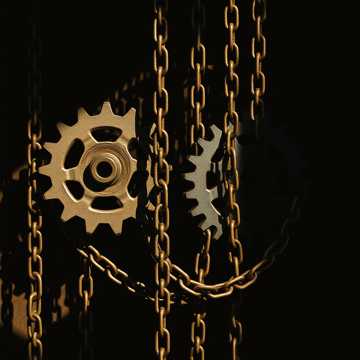 Slow, pounding drums mimic a heartbeat beneath deep, solemn organ chords, Layer in guttural Viking chant with haunting harmonies, enveloped by industrial textures, clattering chains, metallic pulses, distant machinery, The atmosphere is thick and foreboding, relentlessly powerful