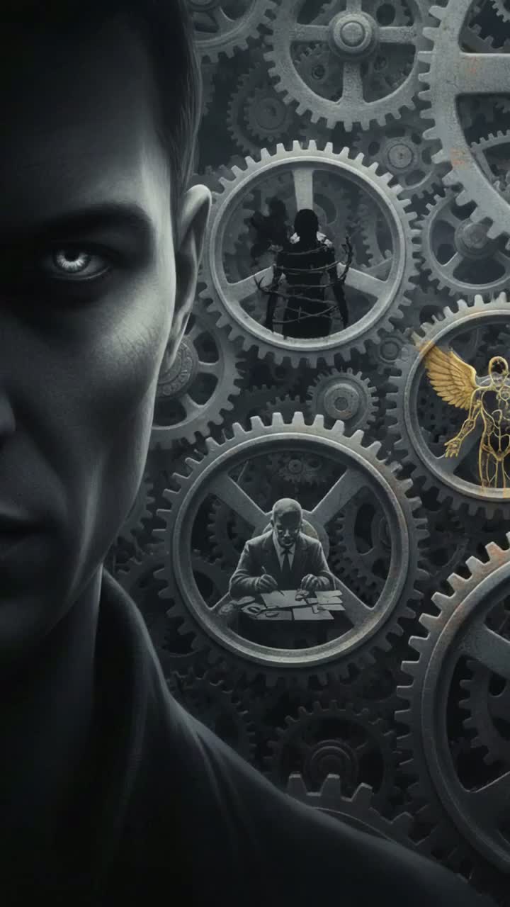 Genre: Dark Electro-Industrial, rhythmic aggression, measured pace, twice-broken and ethereal male vocals in duality, a cold male duet, The palate demands a slow, deliberate pace, prioritizing textual clarity, Instrumentals must be controlled, using cold, crystalline synths and the deep, grinding mechanical percussion of Industrial Metal's controlled sound, The rhythm must be industrial and measured, utilizing the heavy, rhythmic guitar foundations of Nu-Metal without yielding to chaotic crescendo, Vocals progress from a low, seductive whisper (Abyss) to layered, scornful shouts (Verse 5), with a distinct, low Narrator/Observer voice, The instrumental structure features a long, deceptive 'False Waking' suite (clean synths/piano) that rapidly distorts and collapses back into heavy, dissonant static and sub-bass, confirming the inescapable nature of the dark vintage