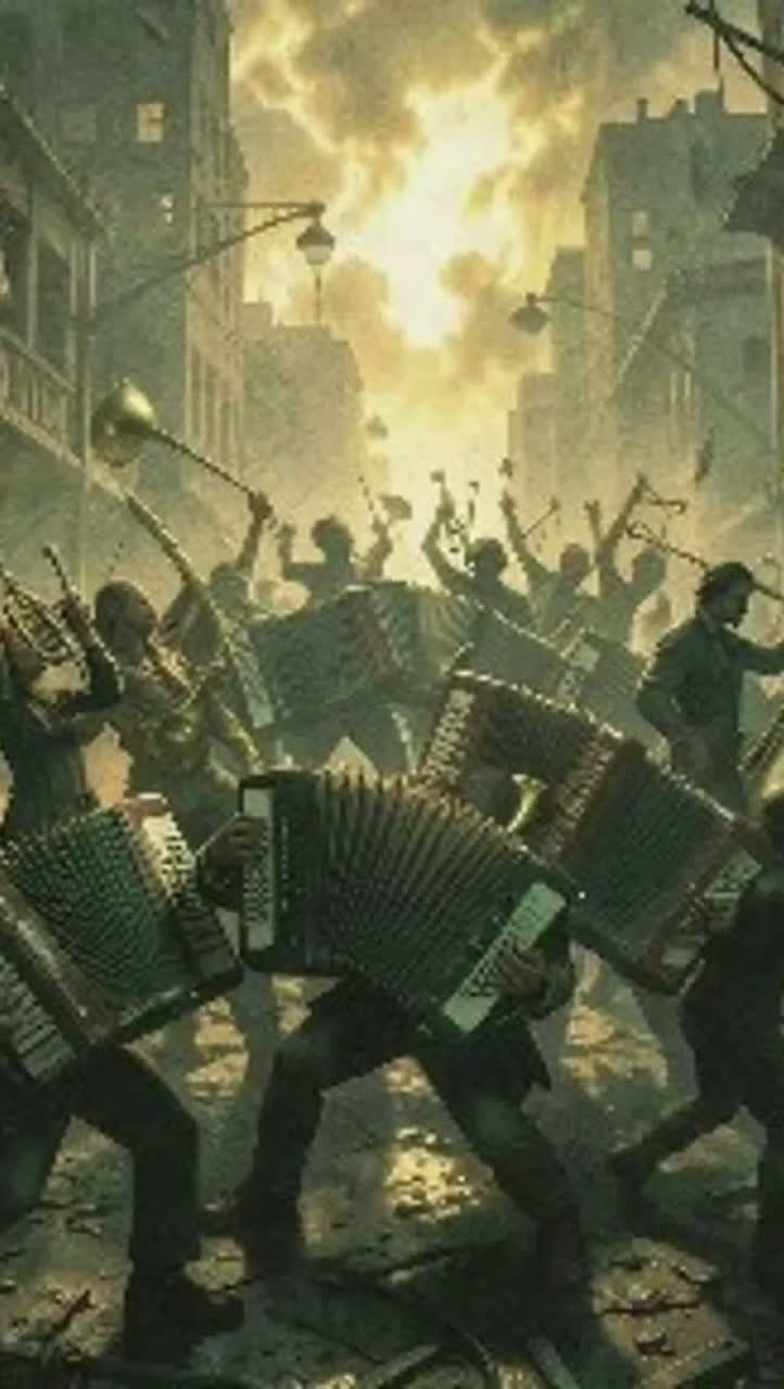 Opening with tremolo accordion riffs and double bass drum blasts, the song fuses polka rhythms into driving death metal intensity, Bagpipes wail harsh, dissonant counter-melodies, doubling the accordion’s pace, The male vocals, nasal and gravelly, snarl above relentless, pounding drums, Each section alternates between off-kilter, frenzied polka beats and brutal, syncopated breakdowns, creating a wild, chaotic tapestry, The bridge erupts in swirling bagpipe-accordion duels before a furious, drum-