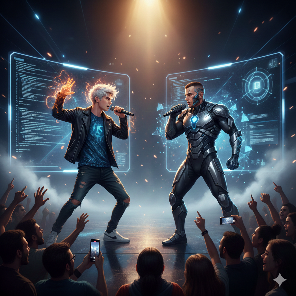 Futuristic rap battle, human vs AI theme, Cold mechanical contrast vs emotional human rap, Dark minimal beat, tense atmosphere, Japanese rap, rap battle, underground hip hop, Hard boom bap beat, BPM 92, Aggressive male vocal, sharp and rhythmic flow, No melody, no singing, rap only, Intense, confrontational battle atmosphere, Crowd reaction, cypher style, Live performance, high energy, raw vocals, crowd noise, call and response, on-stage feeling, slight mic distortion, one-take recording, concert atmosphere