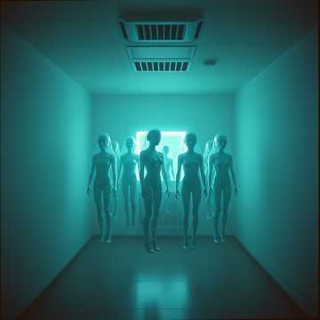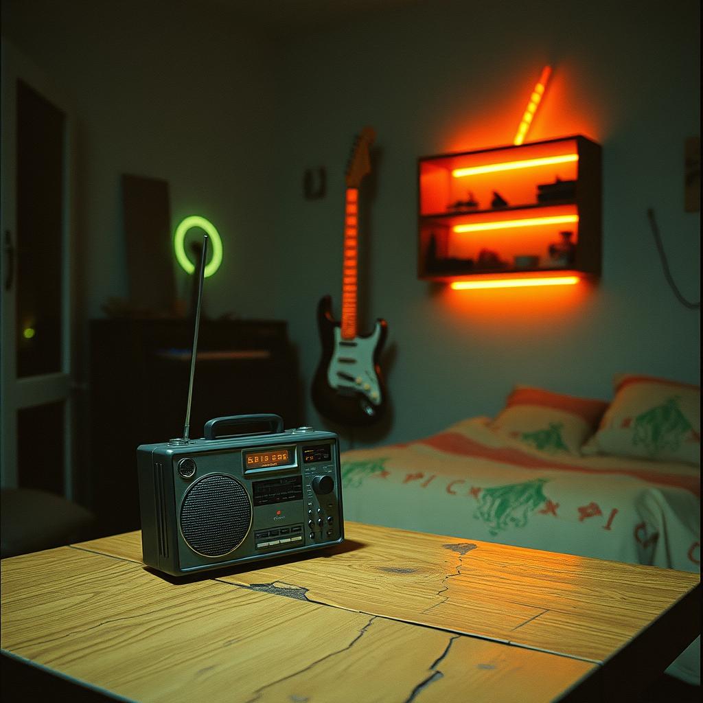 Dark futuristic electronic music, Minimal and atmospheric, Slow to mid tempo, Cold synths, subtle pulse rhythms, Clean electric guitar with delayed, reverb-heavy textures, Sparse, atmospheric guitar lines (not lead-focused), Detached and introspective vocals, Sci-fi mood with quiet tension