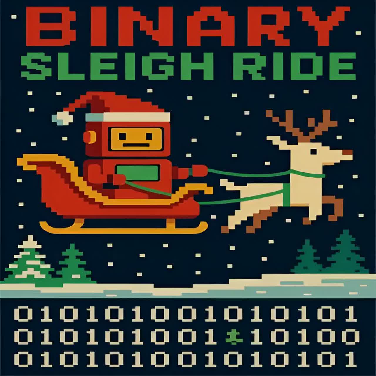 Begin with a Speak & Spell–inspired robotic voice atop a bed of twinkling chiptune arpeggios, syncopated by bright synth sleigh bells, Mid-tempo groove pulses through crunchy digital glitch and bit-crushed drum accents, Retro synth layers provide festively playful, nostalgic textures throughout