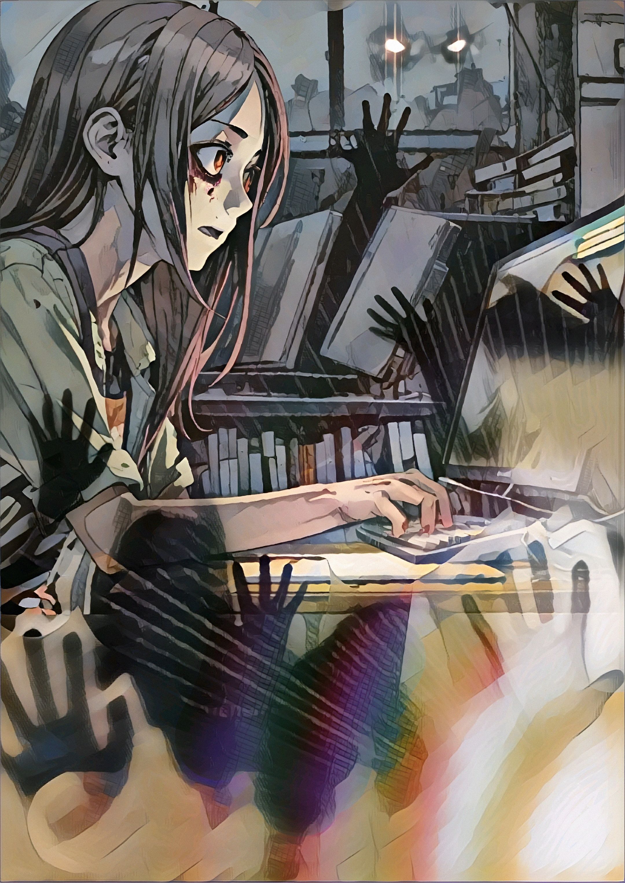 [Fast stoner/kraut rock, ~170 BPM, 4/4, Female lead vocals: sweet & laid-back verses, raspy & shouted choruses, Repetitive, catchy hooks, English sung verses/chorus; Spanish spoken bridge, whisper → shout, mantra style, Instruments: fuzzy down-tuned guitars, hypnotic distorted bass, motorik drums, neon synth arpeggio, sirens/static FX, Atmosphere: apocalyptic, urgent, cinematic, chaotic, Outro powerful, abrupt, “Digital Zombies”: self-made plague, pandemic + tech theme, ]