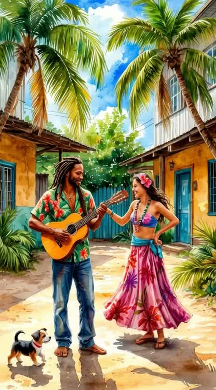 Reggae, ragga, positivity, tropics, Jamaican music, bongos, ukulele, laughter, male vocal, Positive, joy, a sunny day, the sound of the sea, the singing of tropical birds, and the voices of women and children