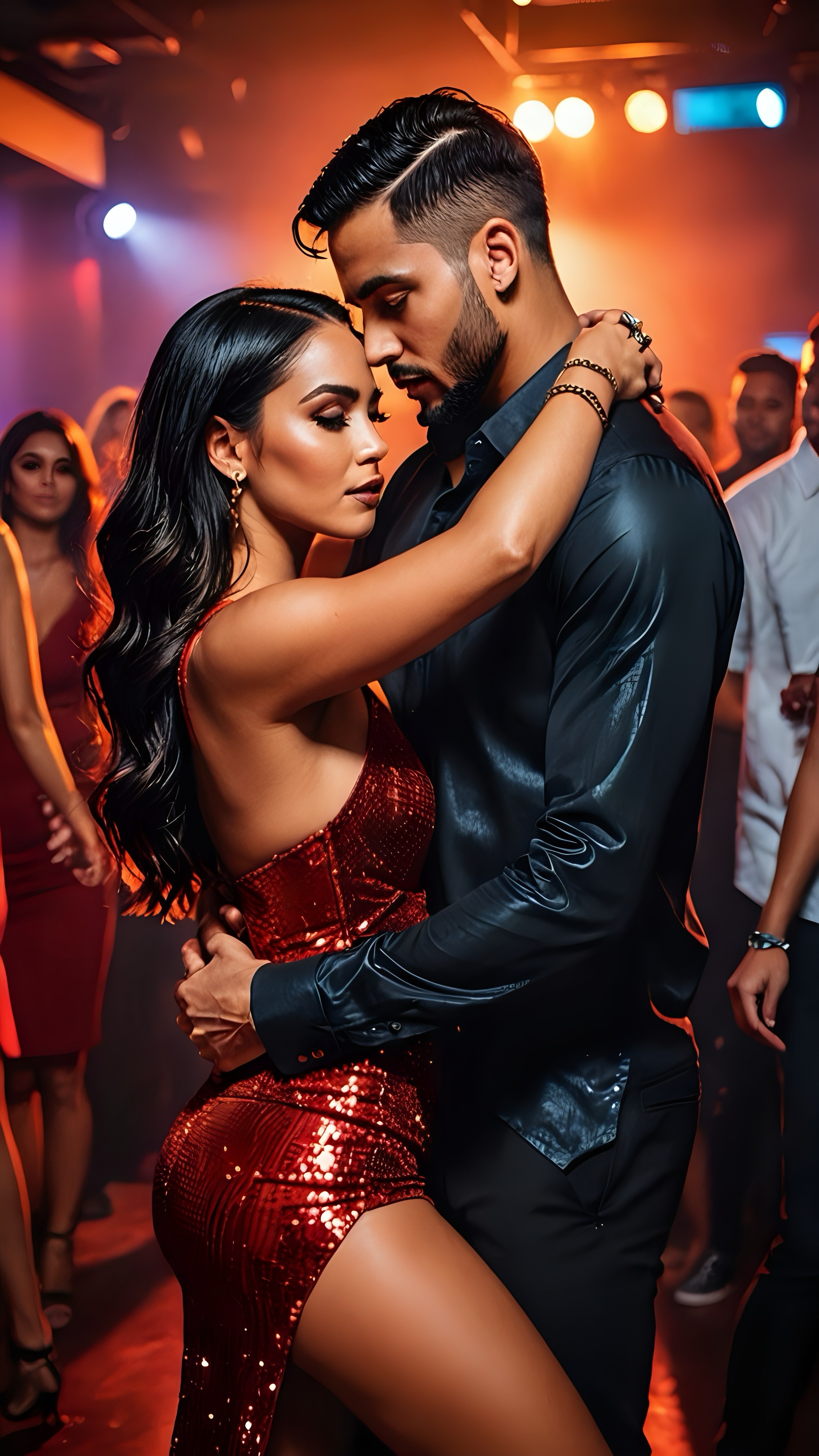 reggaeton, Latin pop, tropical pop, duet, male with baritone vocals, smooth and warm, female with Mezzosoprane vocals, clear, emotional, sultry, Spanish, Verführerisch & leidenschaftlich, Ein urbaner Latin-Hit über eine magnetische Nacht voller Spannung und Rhythmus, Stimme:
