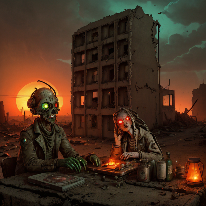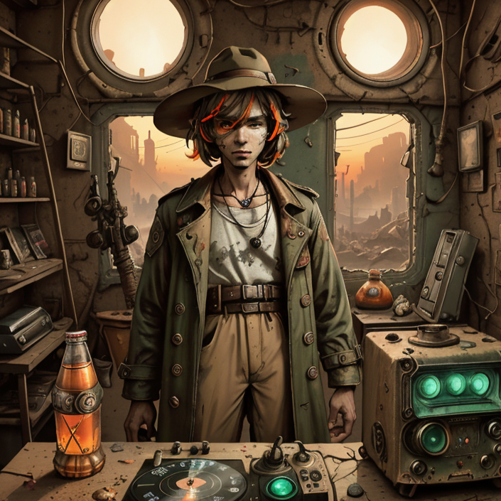 Post-apocalyptic swing/jazz in the style of 1950s radio broadcasts, Warm vinyl textures with crackle and hiss, upright bass, brushed drums, soft piano, playful brass accents, Sung verses, spoken DJ interludes, light tape flutter, subtle reverb, echo, and radio static create a nostalgic, slightly eerie, charmingly quirky atmosphere, Catchy swing melodies and smooth vocals evoke romance and humor in a glowing wasteland setting, ‑Excludes Prompt (english, ‑comma-separated): electronic dance, ‑hardstyle, ‑EDM, ‑trap, ‑modern pop, ‑heavy metal