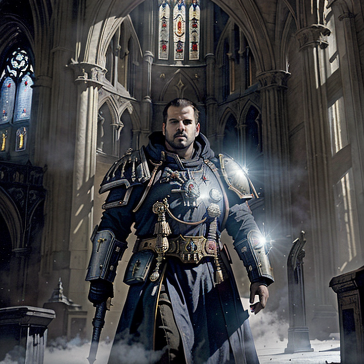 Dark, epic Neo-Classical / Liturgical Gothic with militaristic call-and-response elements, Deep, authoritative baritone and bass vocals, rough/raspy textures, maximal cathedral reverb, ethereal choir pads, minimal percussion, monumental strings and brass, cinematic soundscape, Hohepriester commands, Space Marines respond in staccato chant style, evoking grimdark ritual and ritualistic war call, ‑humming, ‑yodelling