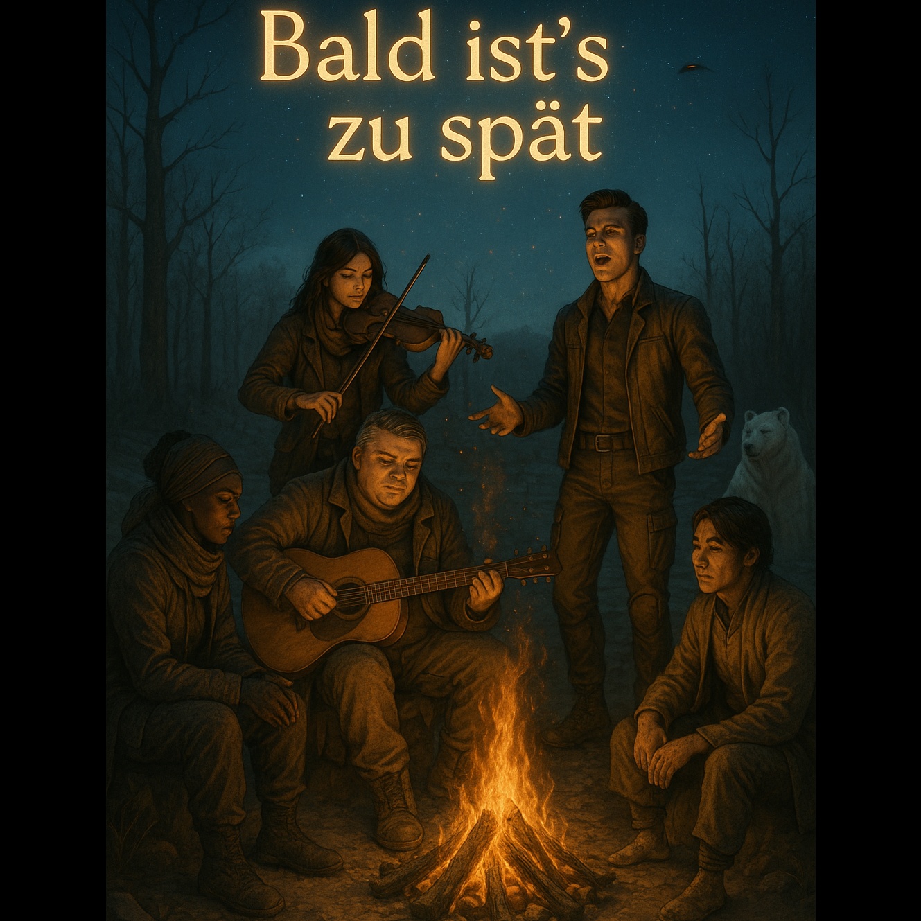 Acoustic guitar (fingerpicking), Cello or violin (soft, sustained notes), Light percussion (brushes, shaker), Piano (sparse, gentle chords), Harmonica, A calm, emotional campfire song with a slow acoustic guitar as the main instrument, The mood is introspective and melancholic, yet warm and human, Soft fingerpicking patterns, a gentle tempo, and subtle atmospheric textures create a feeling of sitting by a fire under the stars, The lyrics explore serious themes like environmental destruction, loss of natural beauty, and the silence that follows when nature fades away, The tone is poetic and thoughtful, with imagery of burning forests, rising seas, fading birdsong, and forgotten promises, It’s not a protest song — it’s a quiet reflection, a song that invites silence after the last note, Vocals should be intimate, honest, and emotionally raw, as if confiding something deeply personal, Mood keywords: reflective, intimate, sorrowful, warm, acoustic, honest, organic, nighttime, slow burn