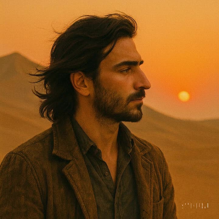 An intense fusion of Oriental Metal and Industrial Metal, The music blends heavy, down-tuned, syncopated electric guitar riffs and pounding industrial drums with authentic Middle Eastern instruments like the Saz or Oud and exotic percussion (darbuka, bendir), Atmospheric synthesizers and traditional oriental string arrangements provide a dark, epic backdrop, The male vocals are a dynamic mix of aggressive, rhythmic shouts/growls and powerful, clean-sung melodic passages with a dark, majestic tone, The overall mood is epic, aggressive, ancient, and modernly brutal, creating a soundscape of a forgotten warrior rising for a final battle, The song ends decisively on a powerful final instrumental hit