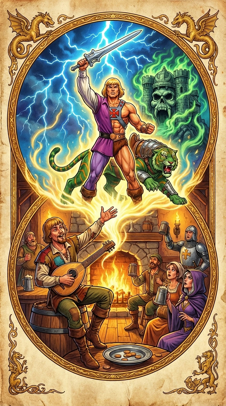 [Mood: Playful wonder with heroic grandeur, tavern warmth, bemused ironic distance during villain descriptions]