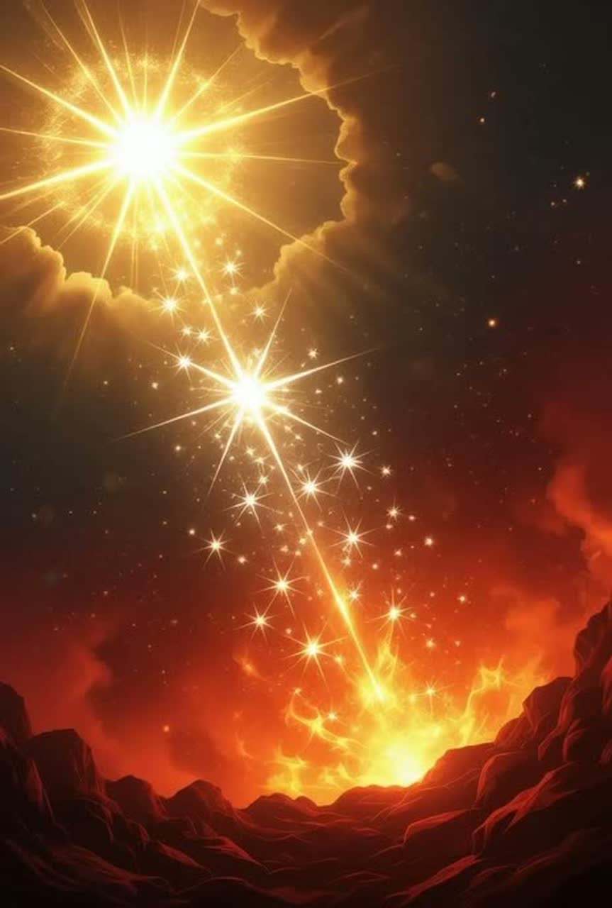 Key: D Minor (for its dark, emotive quality, shifting to F Major in the final verse for hope), Tempo: Slow and deliberate (around 60 BPM), with slight increases in the bridge for urgency, Mood: Ethereal, celestial, and dramatic, with dynamic shifts from soft and haunting to powerful and triumphant, Instrumentation: Harp, violin, cello, atmospheric synth pads, choir, subtle percussion (cymbals, soft drums), piano, glockenspiel, and chimes, Vocal Style: A mix of solo soprano (pure and piercing) and tenor (warm and grounding), with a celestial choir for harmonic depth, Production Effects: Heavy reverb on vocals and instruments to create an expansive, heavenly sound, Use echo effects sparingly in the spoken word sections for emphasis