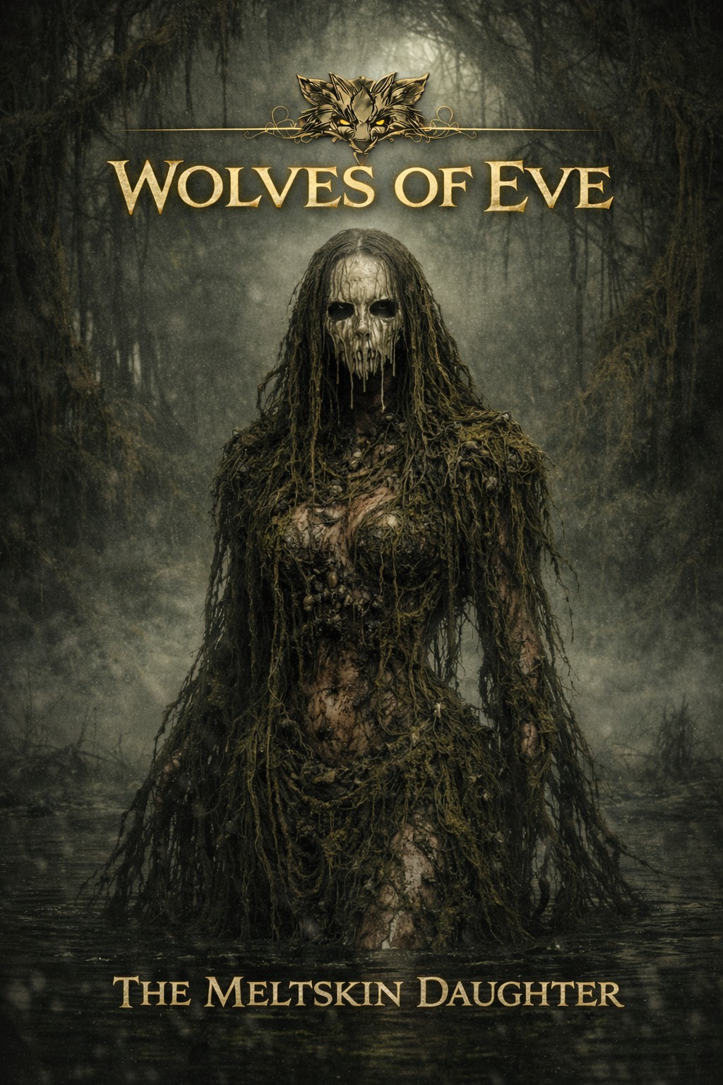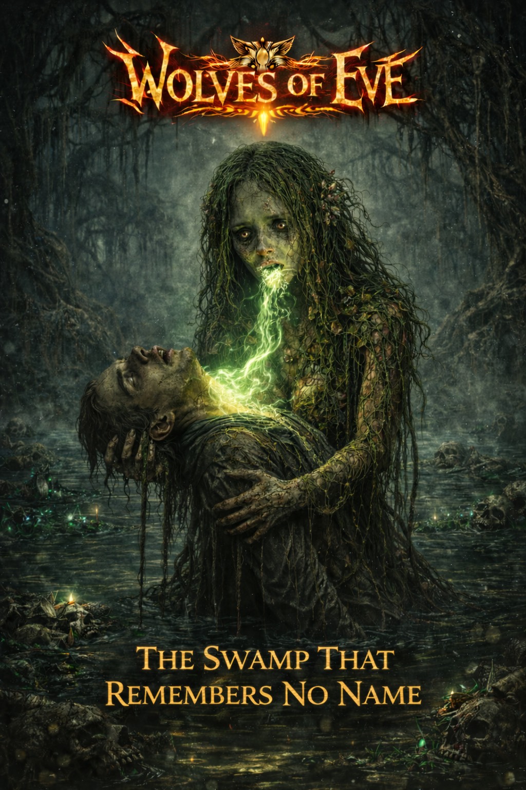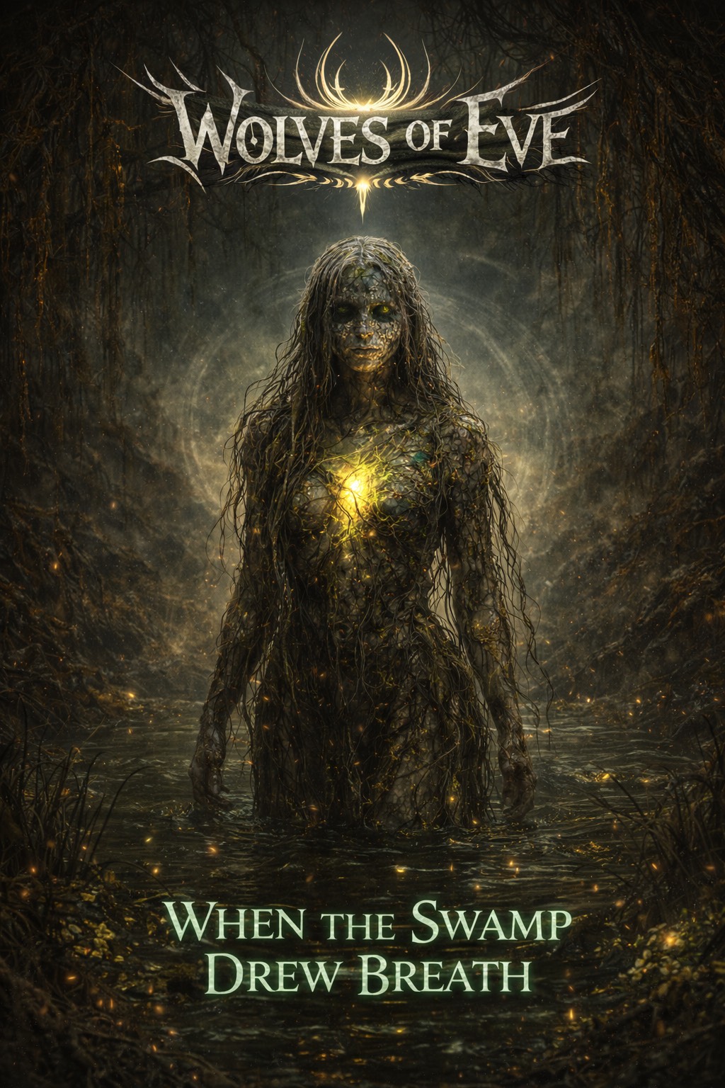 Female-fronted Powerwolf-style symphonic power metal, driven by fast galloping double-kick drums, crushing heavy guitars, and towering, oppressive church organs that feel stolen from a flooded cathedral, Massive Latin and Gregorian choirs chant like a corrupted mass, voices echoing through stone halls swallowed by moss and rot — sacred hymns warped into something wet, feral, and wrong, The atmosphere is dark, gothic, and religious, but twisted through bog-born heresy: divinity decaying, holiness melting, beauty turning predatory, The music feels epic and violent, yet seductive and terrifying, as if the church itself has sunk into a swamp and learned to breathe, Vocals are powerful, commanding, and ritualistic — a priestess-howl rather than a sermon — shifting between soaring melodic dominance and snarling, intimate menace, as if the singer feeds on the listener’s attention, Overall tone: wild, feral, divine, and horrifying — sacred power metal