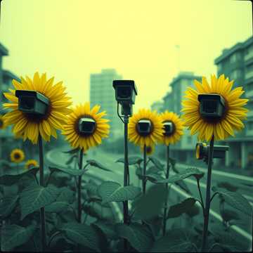A art punk track with a paranoid and surreal tone, set at ~150 BPM, The rhythm section is tight and dry: snappy funk-influenced drums, locked-in staccato basslines, and angular guitar riffs with clean, jagged strums, Add minimal but unsettling synth textures—cold, analog, and lurking behind the groove, Vocals are male, half-spoken, half-sung in a neurotic tone, with phrasing that sounds anxious, twitchy, and conspiratorial, The lyrical delivery is talky, repetitive, and rhythm-driven—like a man melting under summer heat and convinced that sunflowers are surveillance devices, Chorus sections build intensity through phrasing repetition and sudden instrumental jolts, Keep the mix punchy, raw, and slightly off-kilter, Add light tape hiss and occasional glitch pops to emphasize mental instability, The overall mood is urban paranoia dressed in funky stiffness: weird, catchy, and slightly dangerous