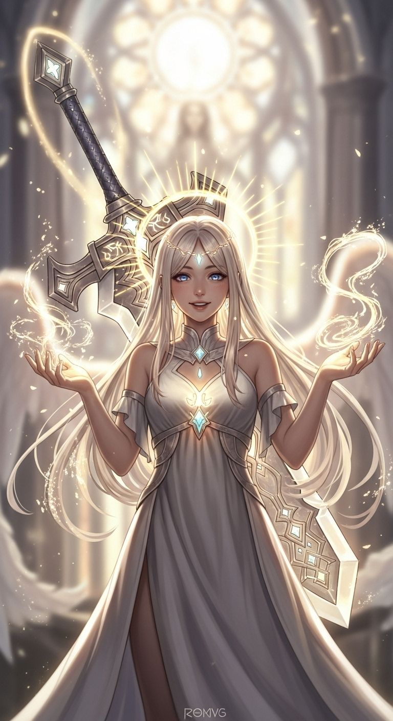 A fantasy rock fusion filled with light, grace, and power — the sound of a holy warrior of light standing against darkness, Combines emotional rock guitars, orchestral strings, and game soundtrack elements (epic drums, choir, shimmering synths), The tone is gentle yet powerful, evoking both hope and divine strength, Lyrics explore purity, courage, and the eternal battle between light and shadow, expressing compassion even toward enemies, female vocals
