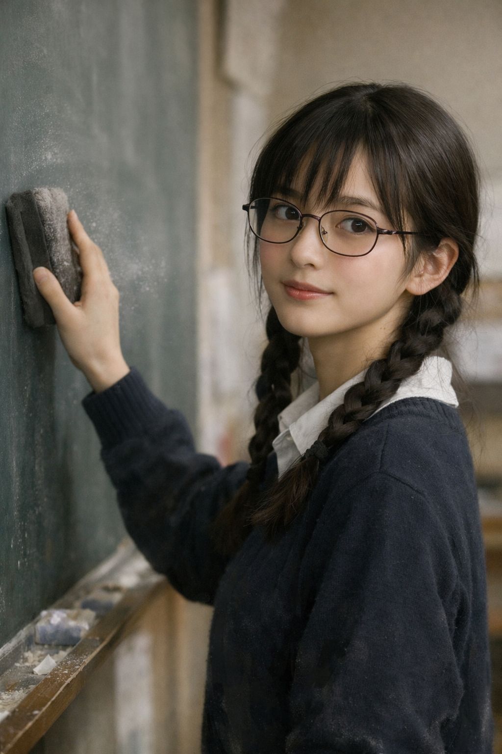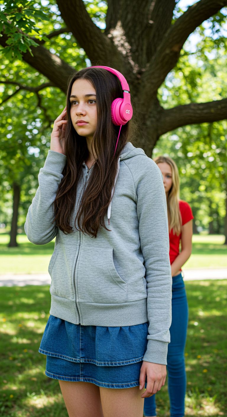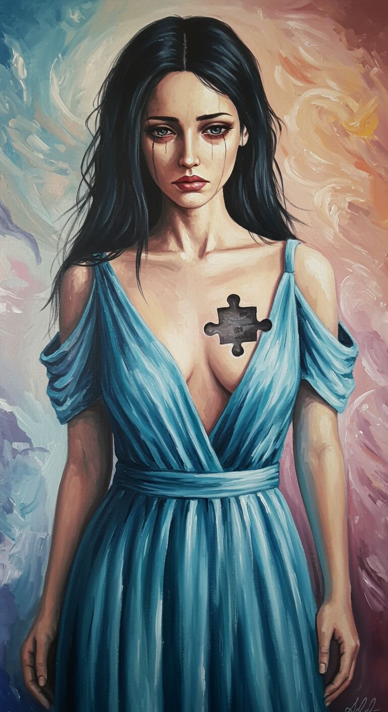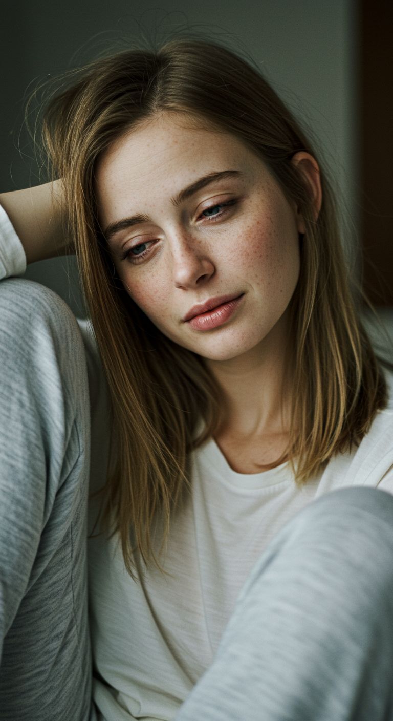 “A hazy emotional portrait, soft backlighting, subtle melancholy, Themes of self-doubt, inner contrast, fragile confidence, and imperfect beauty, Light bokeh, shallow depth of field, slightly out-of-focus textures, Muted pastel tones mixed with darker shadows, A blend of innocence and distortion, capturing a girl who feels misaligned with the world, High-detail emotional realism, cinematic soft grain, reflective mood, bittersweet atmosphere, ”