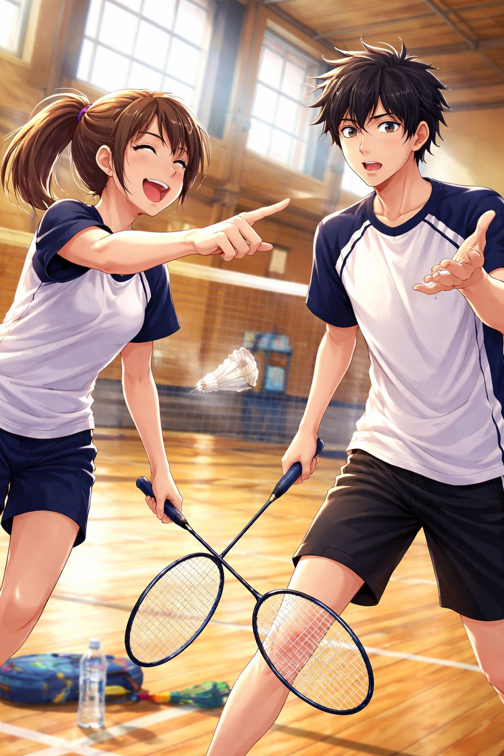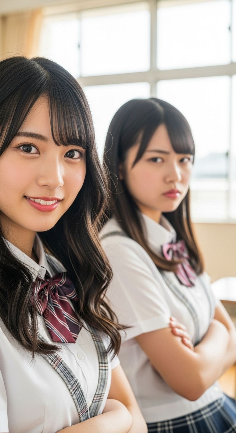 A bold and quirky Japanese pop style blending retro Showa-era aesthetics with modern minimalism, Express restrained sensuality and emotional tension beneath innocence — playful yet melancholic, Sharp, synchronized movements, school-uniform-inspired fashion with a rebellious twist, Cool blue tones, soft shadows, and a slightly nostalgic, cinematic atmosphere, Confidence that feels awkward on purpose — elegant, strange, and irresistibly human, The mood is “trying to act adult, but emotions still spill over, ”