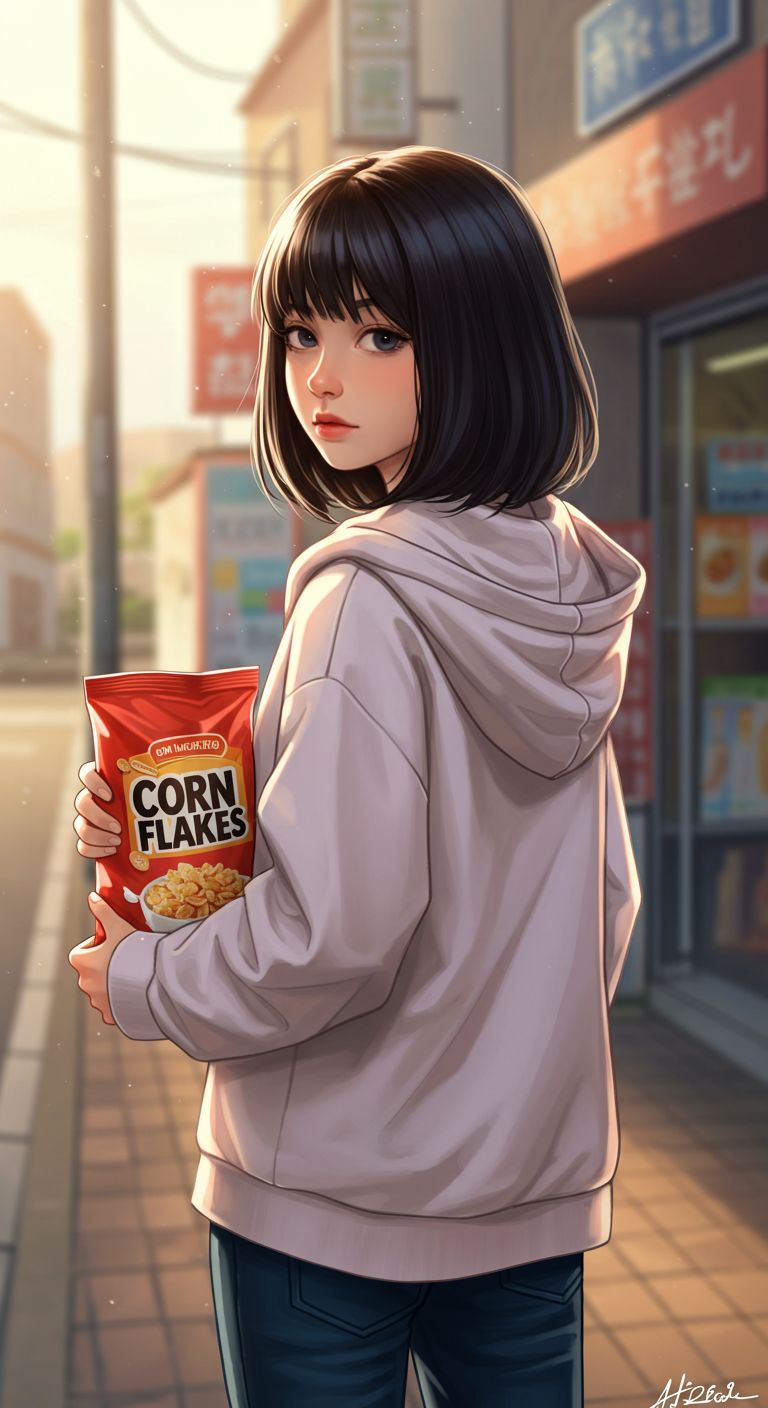 コーンフレークを持った女