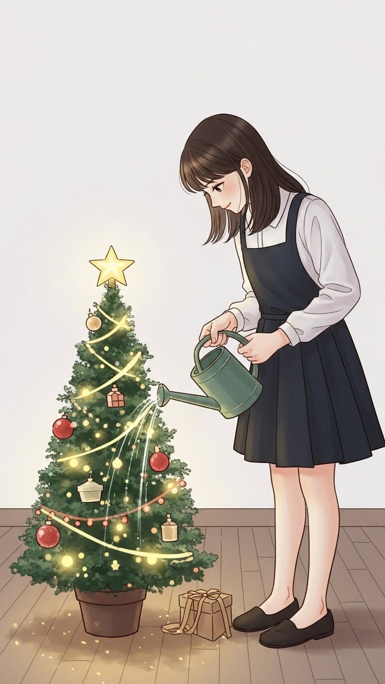 A whimsical, heart-warming pop tune with a dreamy, pastel vibe, Focus on an adorably airheaded girl watering a toy Christmas tree, blending gentle acoustic warmth, soft glockenspiel sparkles, and magical holiday innocence, Light, playful rhythms, childlike wonder, and cinematic winter glow, Cute, surreal, slightly fantasy-like mood