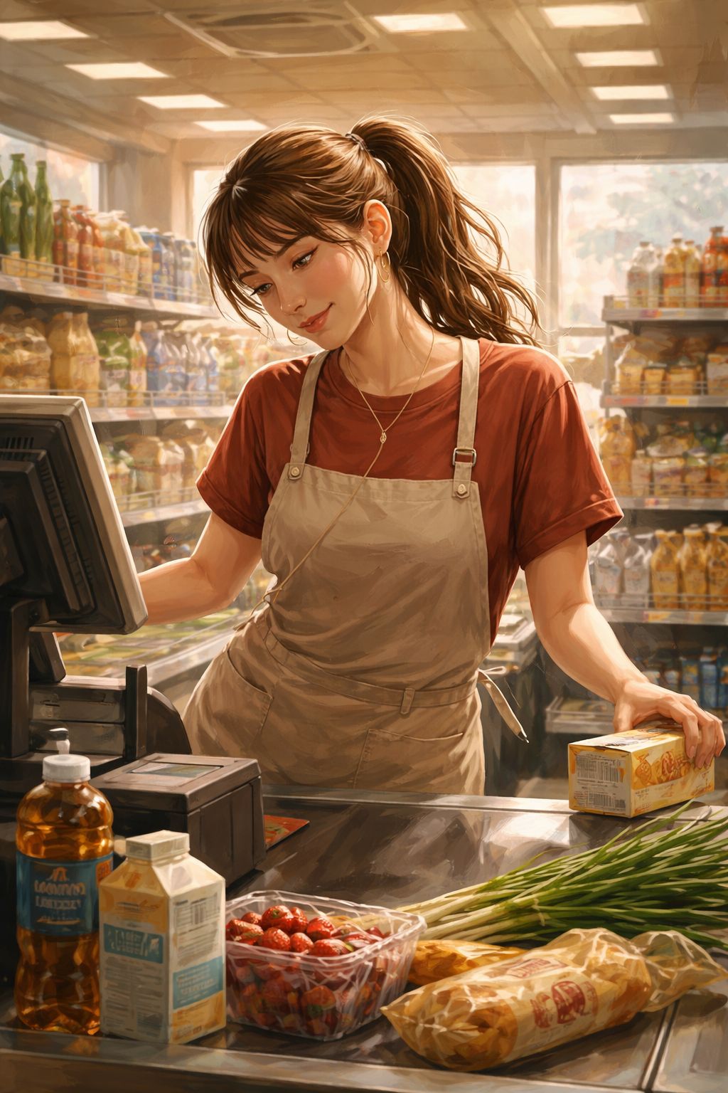 A quirky, slice-of-life song with a subtle groove — a male narrator observing an ordinary supermarket cashier who unconsciously sways side to side while scanning items, Minimalist pop-rock with funky undertones, steady mid-tempo rhythm, dry humor and gentle irony, Everyday realism turns into quiet fascination; barcode beeps become percussion, body movement becomes rhythm, Casual vocals, light cynicism, warm human charm, cinematic mundanity, understated but memorable