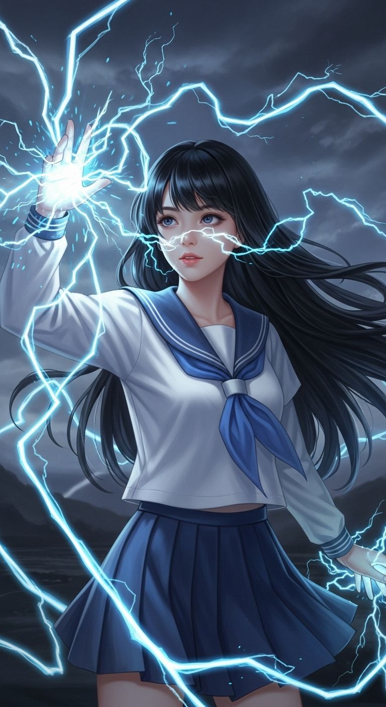 A high-voltage rock style fusing electric thunder energy with teenage passion, The protagonist is a schoolgirl who commands lightning, balancing love, study, and battles against villains, The music blends hard rock guitar riffs, electronic storm effects, and emotional vocals that crackle like thunder