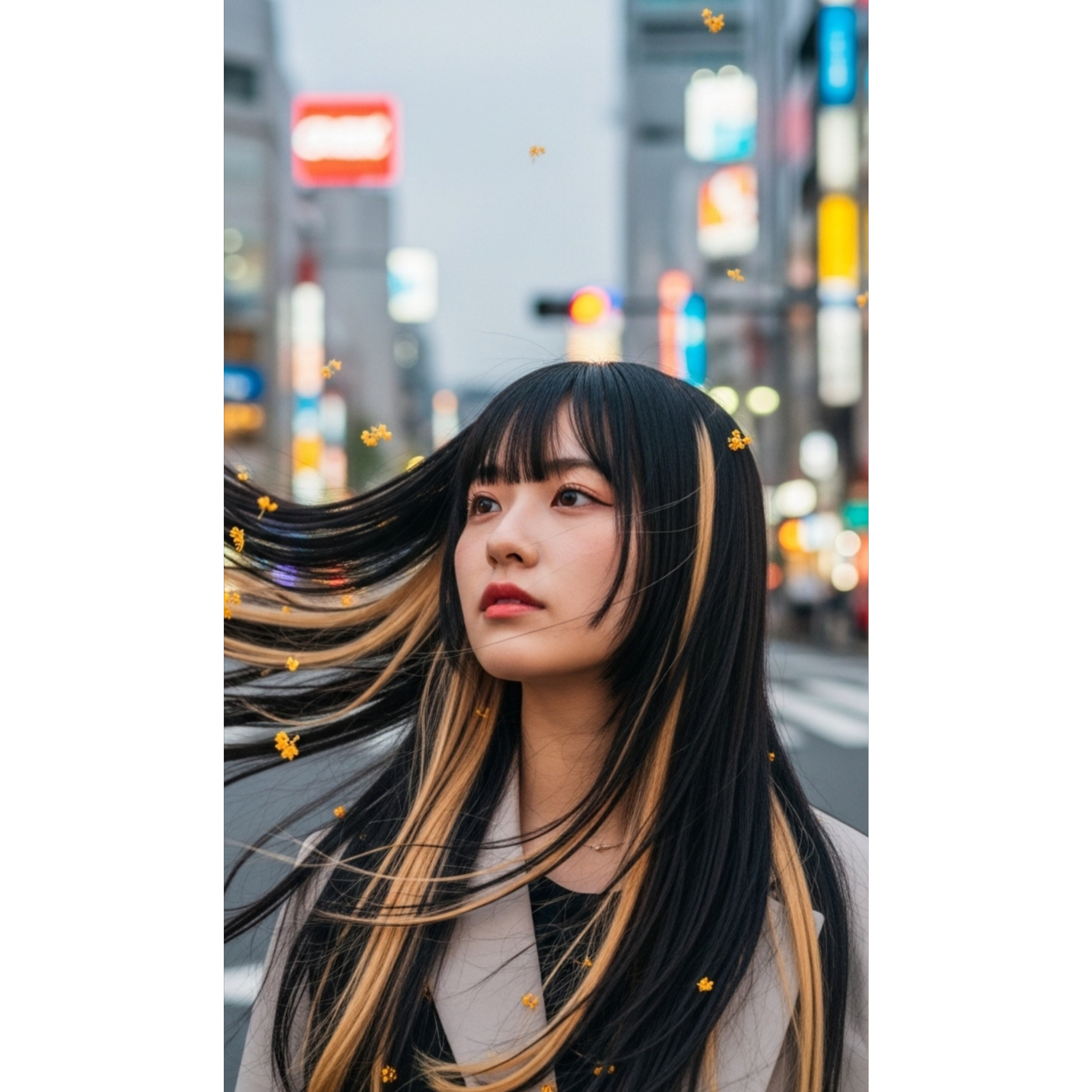 dramatic, female vocals, emotional, A modern Japanese girl group aesthetic — strong yet delicate, quiet confidence in their eyes, Natural beauty, soft but sharp expressions, minimal makeup with glossy skin, wind moving through dark hair, Clean urban background, muted colors, cinematic lighting, shallow depth of field, Emotional stillness mixed with hidden strength, Contemporary fashion, simple silhouettes, effortless cool, Realistic, high-detail, editorial photography style