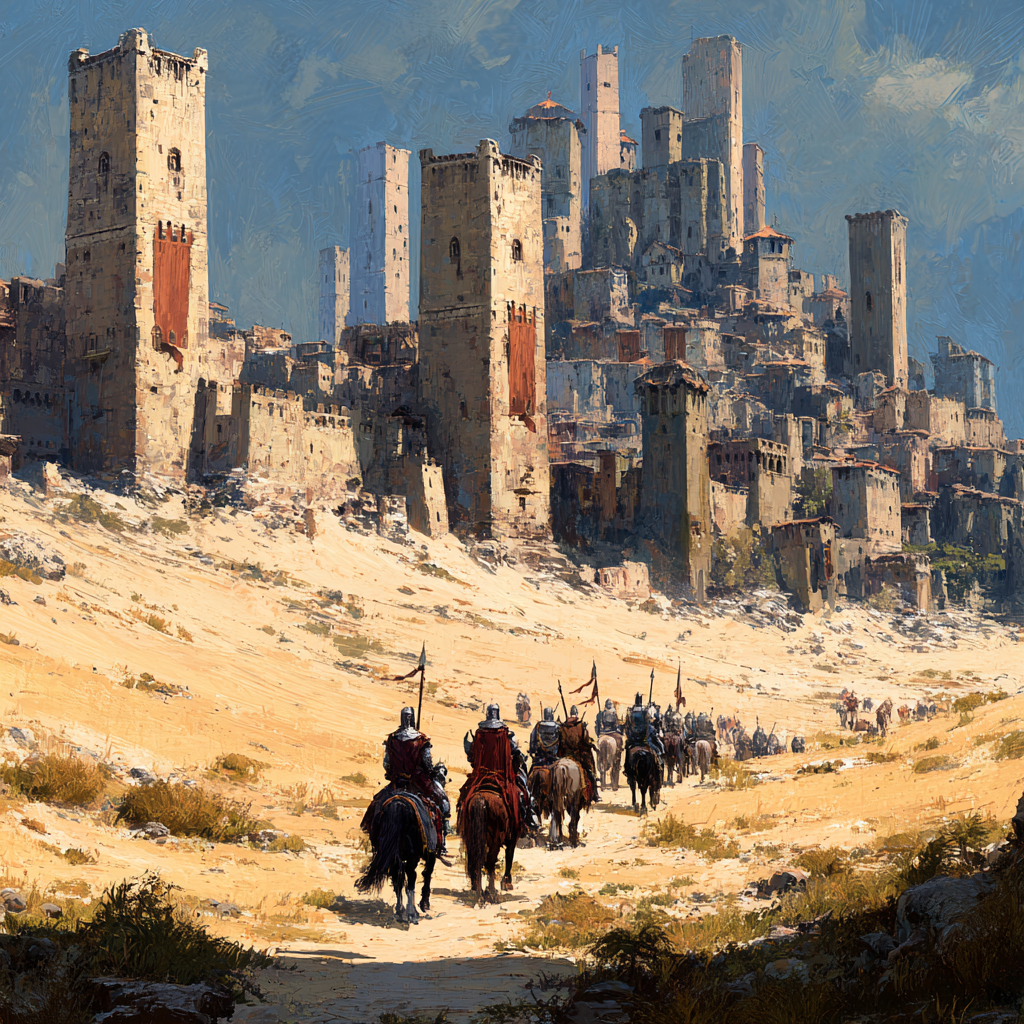 British heavy metal from the early 1980s, Driving, melodic twin electric guitars with galloping rhythms and energetic bass, Punchy acoustic drums with strong snare and crash accents, Dark, epic atmosphere with dynamic buildups, powerful instrumental breaks, and soaring, dramatic male vocals, Anthemic, adventurous, and powerful—evokes images of crusaders, distant lands, and epic journeys