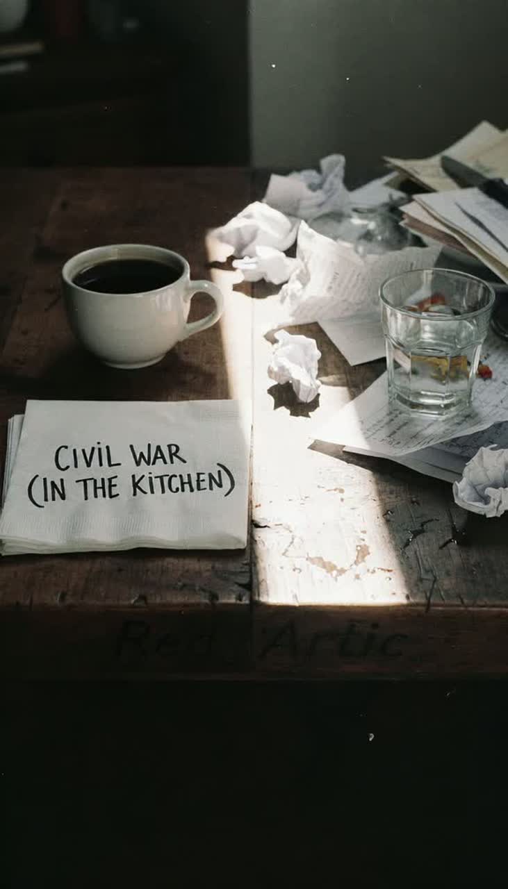 Atmospheric Alternative Rock track with a progressive edge, Start with crisp acoustic guitars and a clean, intimate feel for the verses, featuring a male high baritone to tenor vocal that's dry and precise, almost speak-singing, Build into a powerful, melancholic chorus with driving drums, distorted electric guitars, and lush, layered harmonies with soft falsetto, Include an emotive wah-wah lead guitar solo, capturing a bitter and resigned mood throughout, ending with a cynical fade out, Keep a 138 BPM half-time feel