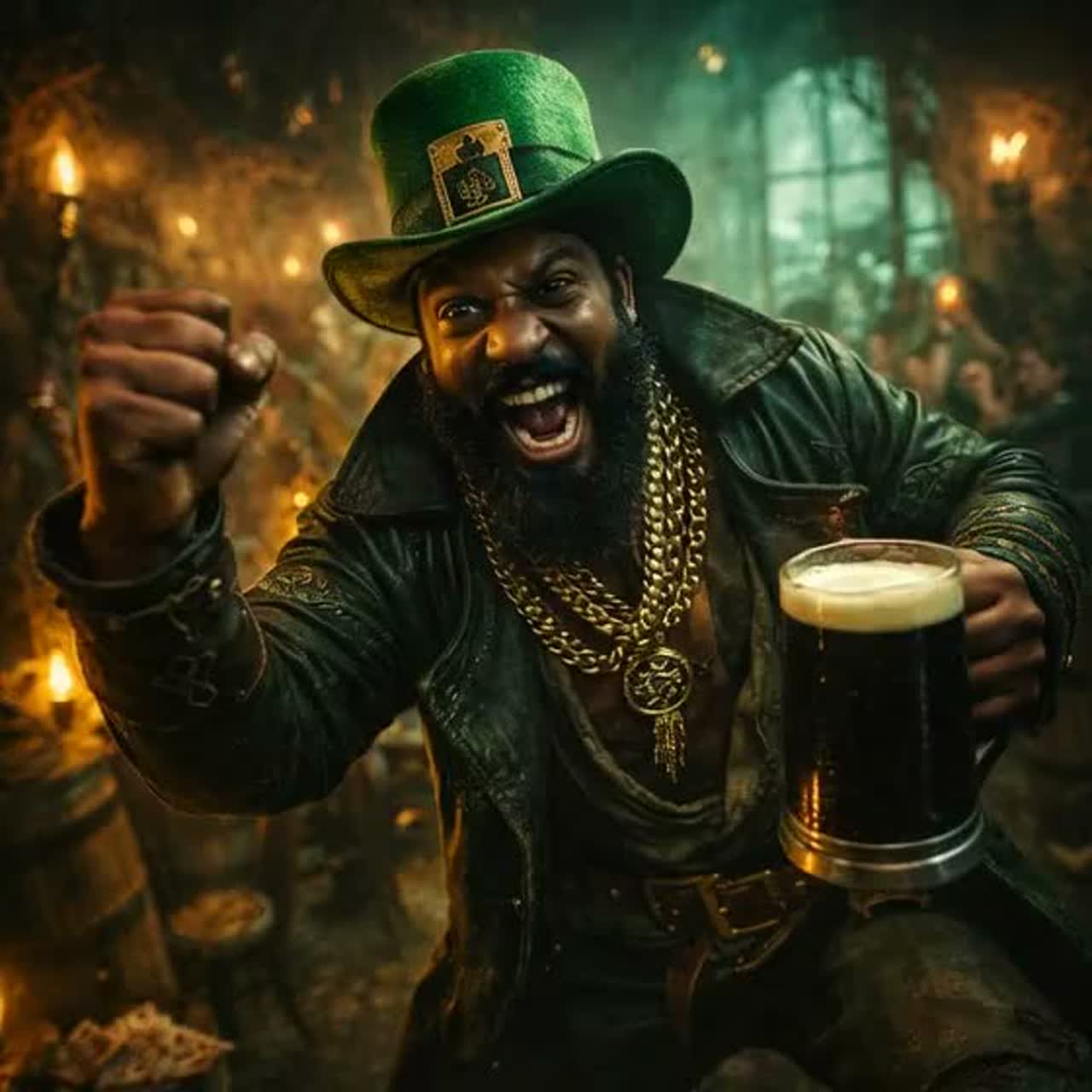 Irish Folk Trap / Celtic Rap with energetic fiddle samples, deep 808 bass, pub-style gang chants, stomping kick drums, clapping crowd ambience, playful whistle melody, Mix of gritty male rap with Irish accent and singalong folk chorus, Slight tavern reverb, pint-glass percussion accents, cheeky mischievous tone but powerful and cinematic, Tempo around 92 BPM, Rhythm bounces like a jig but hits like a street battle, Swear-free but full of swagger