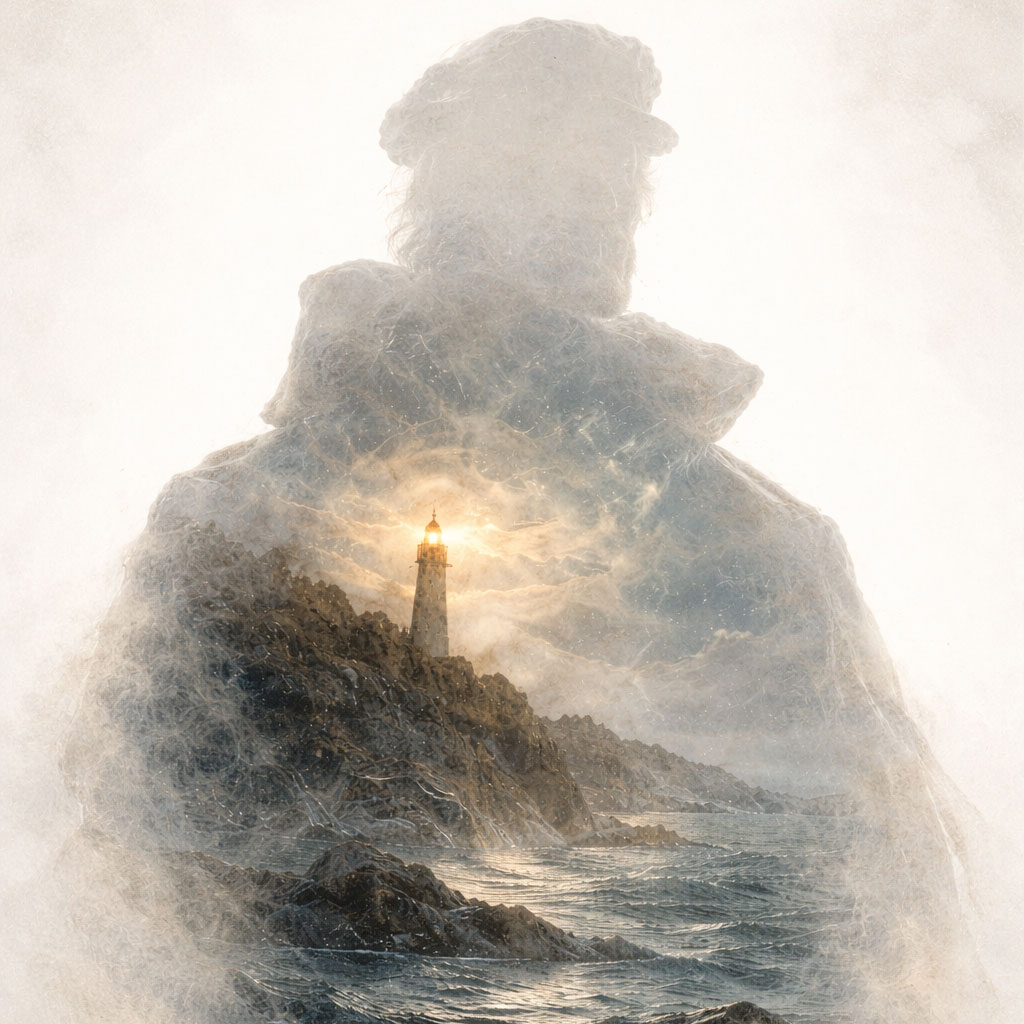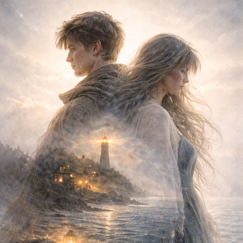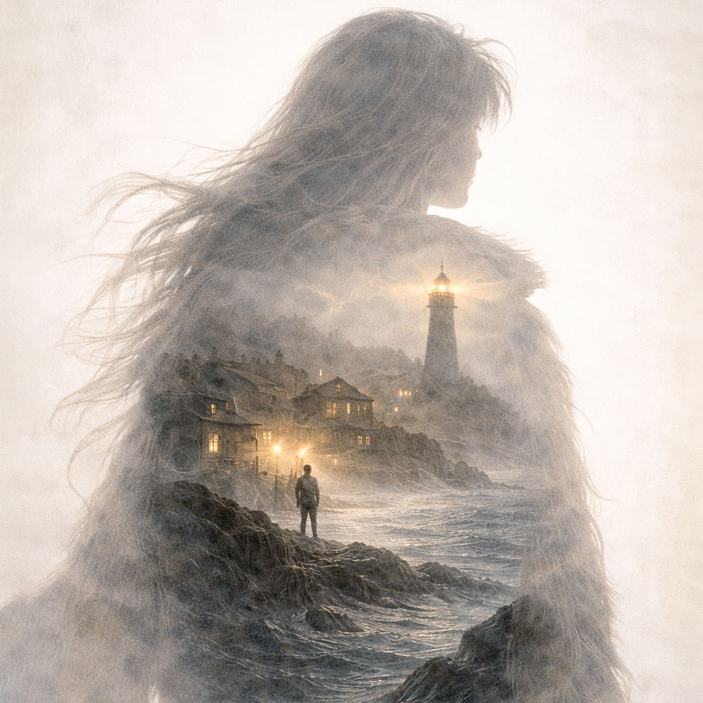 A myth told from five distances: what stayed, what left, what returned, and what was given. A lighthouse remembers love without release.