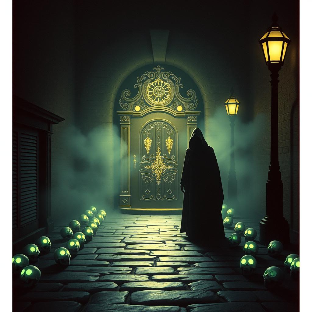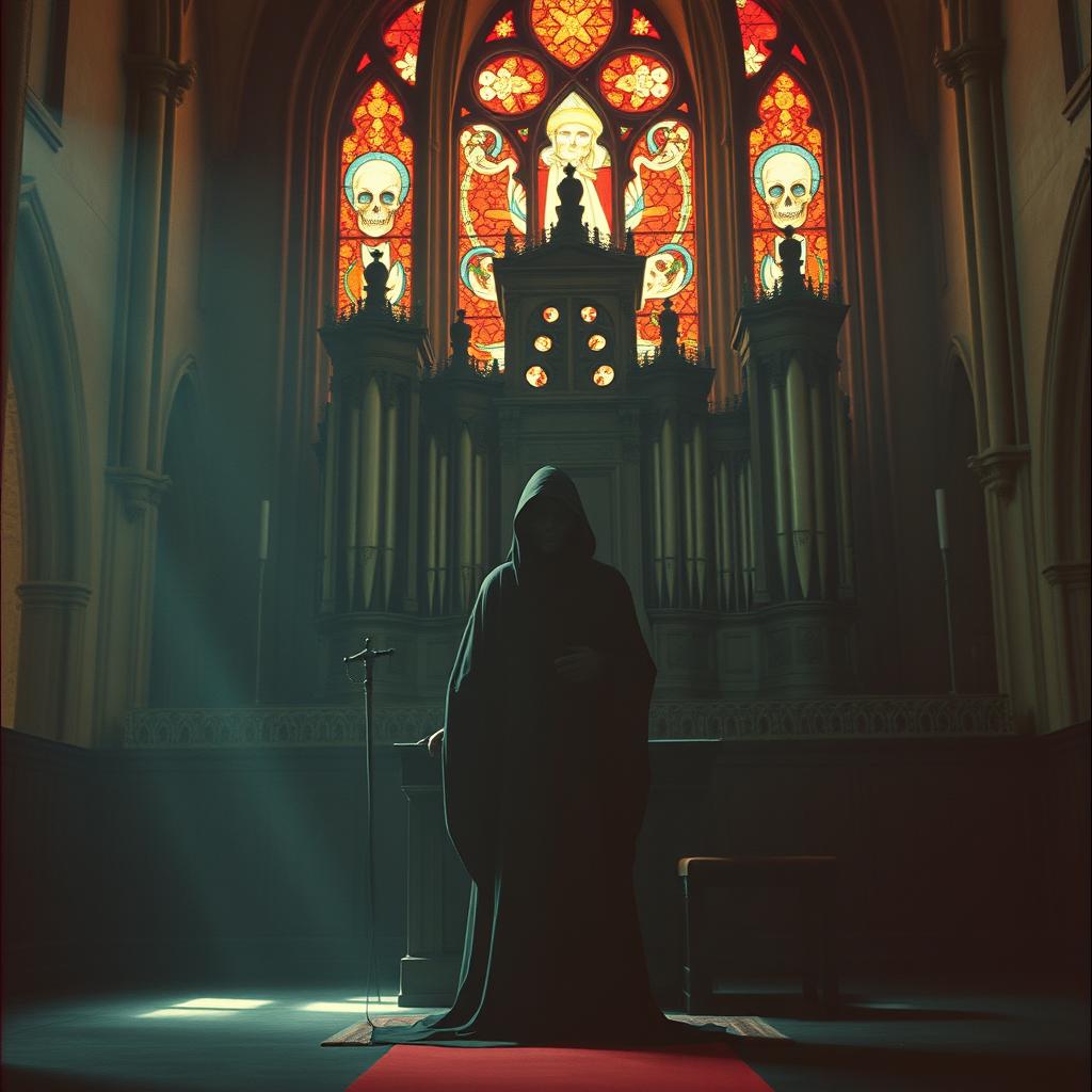 A powerful, Dark and hypnotic Psychedelic rock/Doom metal/Death metal piece with deep bold growling male vocals with hall effect, hypnotic death metal guitar riffs, deep church organ at the intro and background, electronic hall effects at the vocals, energetic techno drum and bass, always dark and doom atmosphere
