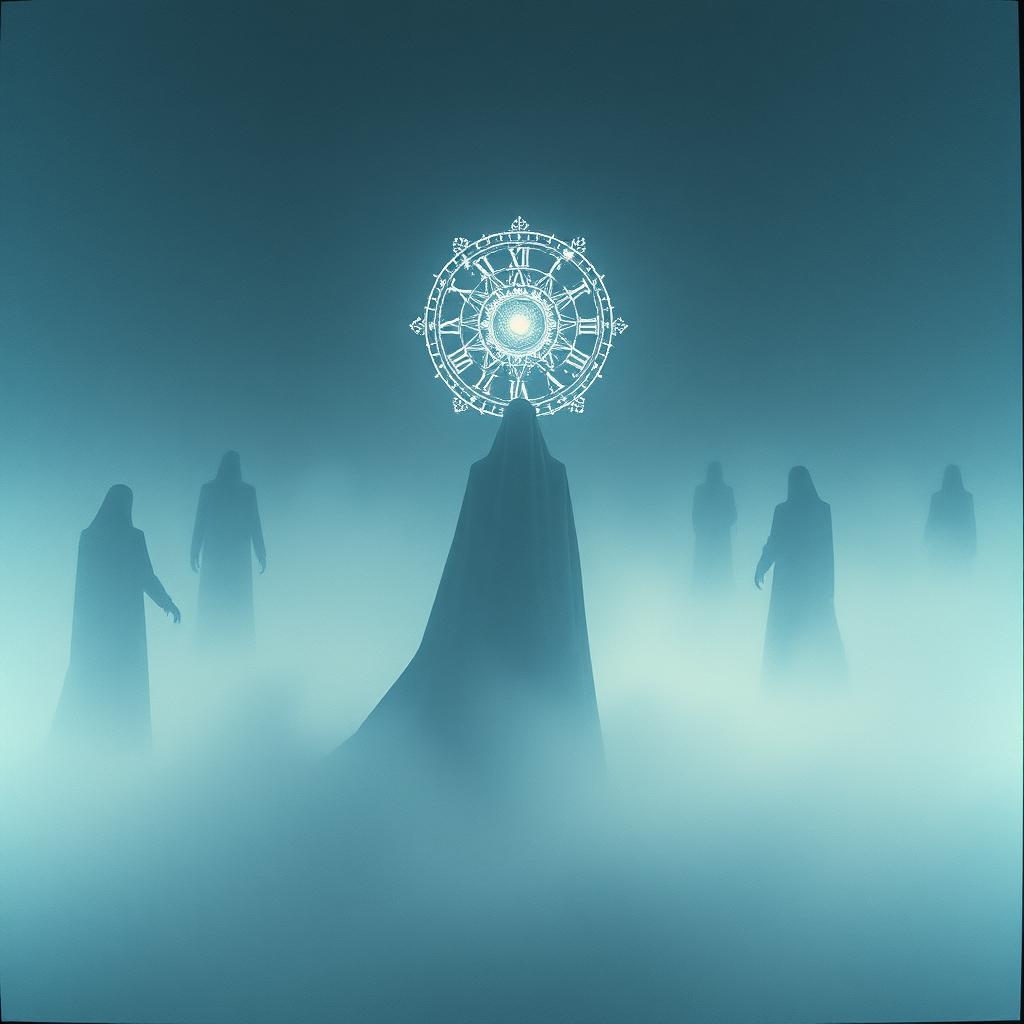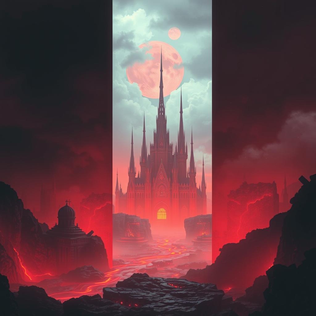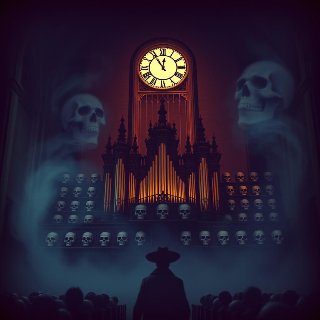 A Dark orchestral gothic metal/Dark romantic piece with a haunting deep soaring male voice changing into a haunting deep soaring female voice, derp church organ and ffluteat the intro, hypnotic death metal guitar riffs, Dark and cinematic vibes, electronic hall effects