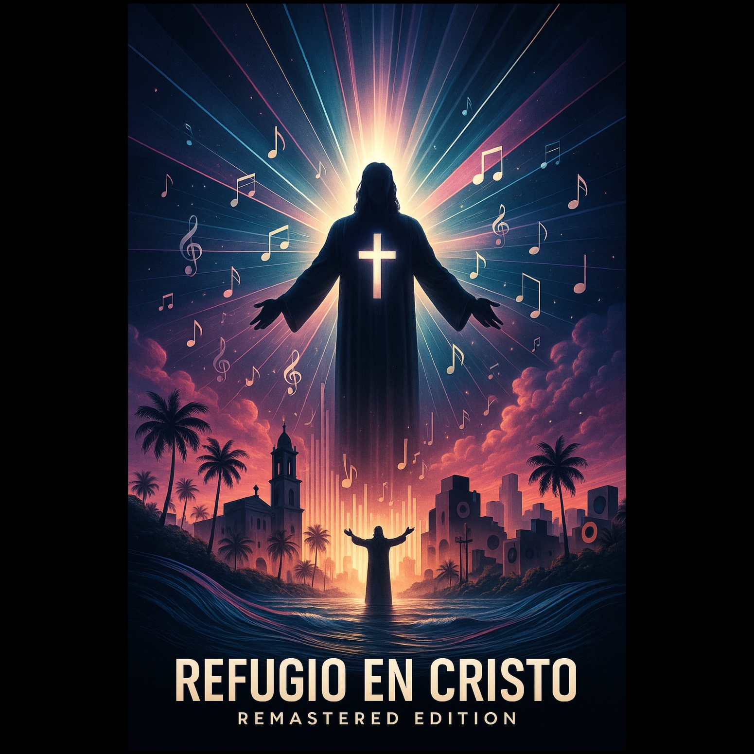 Retro future synth 80s EDM sounds, male baritone voice, Boricua, PuertoRico, CristoVision