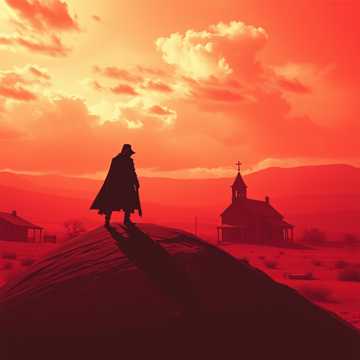 Epic spaghetti western ballad, minor key, haunting whistle melody, tremolo electric guitar, deep male baritone vocals (Clint Eastwood-like spoken-sung delivery), dramatic trumpet, church bell, dusty percussion, choir “ahh” in the background, slow build to explosive finale, cinematic and mysterious
